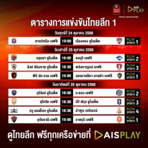 สัปดาห์นี้ลงทำการแข่งขันครบ 8 คู่ 8 สนาม ไฮไลท์สำคัญคือศึกบิ๊กแมตช์ระหว่าง “สิงห์เจ้าท่า” การท่าเรือ เอฟซี ที่ช่วงหลังทำผลงานได้อย่างยอดเยี่ยม มีคิวเปิดรังแพท สเตเดียม รับการมาเยือนของ “กิเลนผยอง” เมืองทอง ยูไนเต็ด ซึ่งจะฟาดแข้งกันในวันศุกร์ที่ 24 ตุลาคม 2568 เวลา 19.00 น. AIS PLAY SPORTS1 ยิงสด