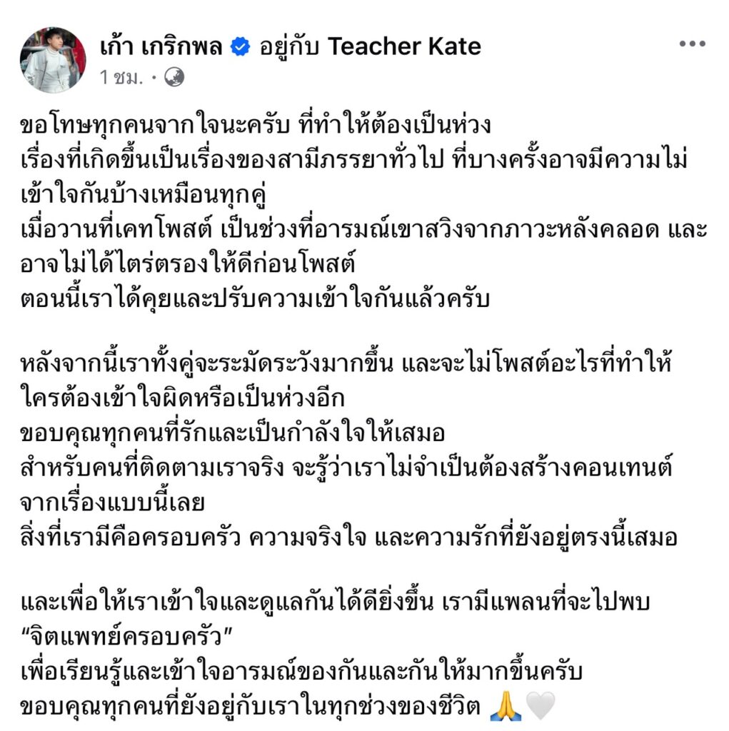 ล่าสุดทางด้าน “เก้า เกริกพล” ก็ได้ออกมาเคลื่อนไหวชี้แจงสถานะว่า “ขอโทษทุกคนจากใจนะครับ ที่ทำให้ต้องเป็นห่วง เรื่องที่เกิดขึ้นเป็นเรื่องของสามีภรรยาทั่วไป ที่บางครั้งอาจมีความไม่เข้าใจกันบ้างเหมือนทุกคู่