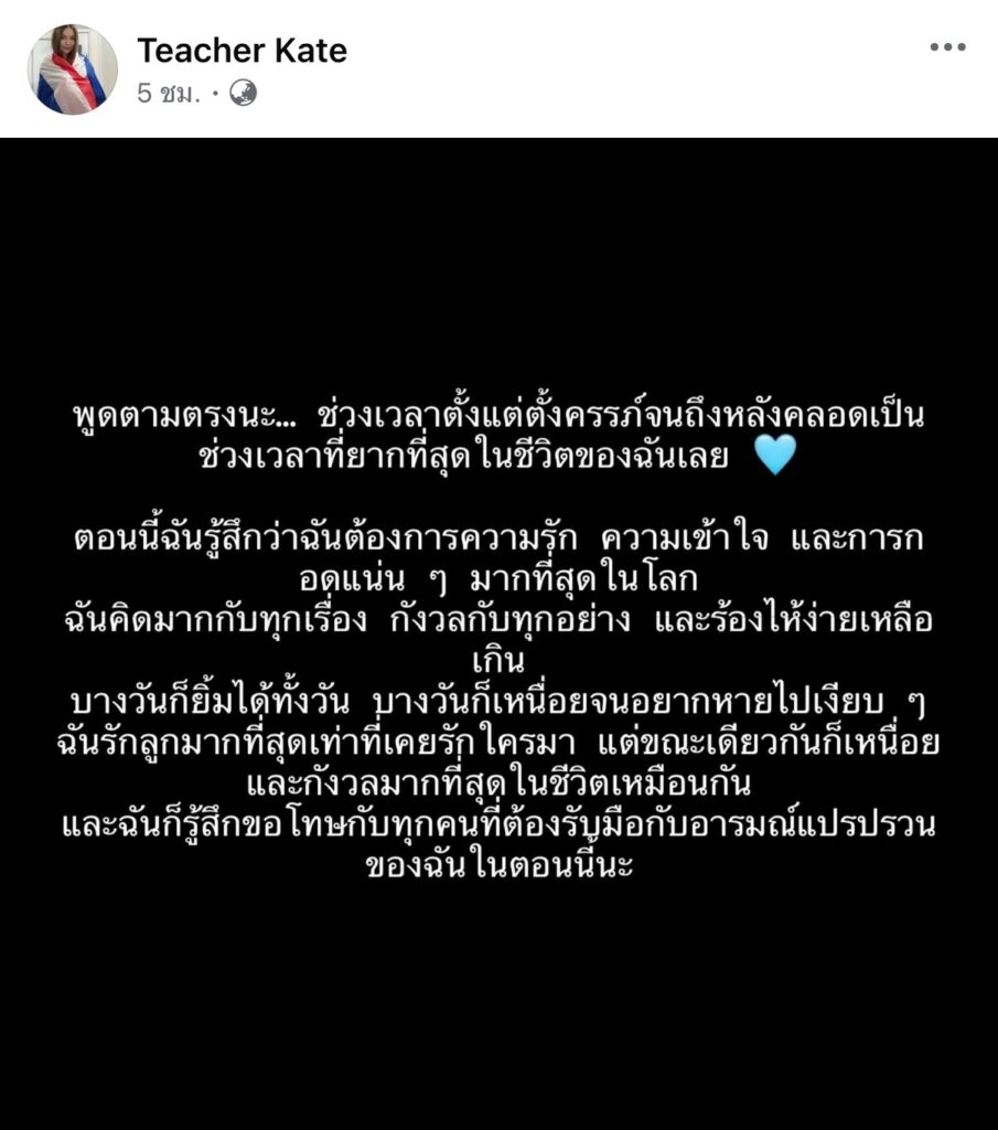 ต่อมาทางด้าน“ครูเคท” ได้ออกมาโพสต์ข้อความอีกว่า “พูดตามตรงนะ.. ช่วงเวลาตั้งแต่ตั้งครรภ์จนถึงหลังคลอดเป็น ช่วงเวลาที่ยากที่สุดในชีวิตของฉันเลยตอนนี้ฉันรู้สึกว่าฉันต้องการความรัก ความเข้าใจ และการกอดแน่น ๆ มากที่สุดในโลก ฉันคิดมากกับทุกเรื่อง กังวลกับทุกอย่าง และร้องไห้ง่ายเหลือเกิน