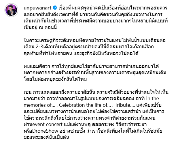 ล่าสุด “อั๋น” ได้เผยความคิดเห็นถึงระเบียบการไว้ทุกข์โดยปรับตัวให้เหมาะสมเพื่อไม่ให้กระทบทุกฝ่าย โดยเขาได้โพสส์อีกมุมมองว่า “เรื่องที่ผมจะพูดน่าจะเป็นเรื่องที่อ่อนไหวมากพอสมควร แต่อยากยืนยันถึงเจตนาที่ดี มาชวนกันคิดชวนกันคุยถึงแนวทางในการเดินหน้ากันในช่วงเวลาที่ประเทศมีความบอบบางมากๆในหลายมิติแบบที่เป็นอยู่ ณ ตอนนี้