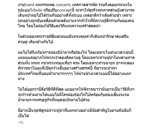 งานEvent มหกรรมพลุ concerts เทศกาลสารพัด รวมถึงลอยกระทงในรูปแบบTribute หรือปรับconceptนี้ จะทำให้ธุรกิจทุกภาคส่วนยังสามารถเดินหน้าต่อไปได้ร่วมกันอย่างดีทั้งระบบ เผลอๆดีกว่าเดิมด้วยซ้ำ เพราะทุกอย่างถูกขับเคลื่อนด้วยพลังงานจากหัวใจที่มีความรู้สึกร่วมกันของคนไทย โดยไม่ต้องใช้วิธีและวิถีแห่งความเศร้าสลดนำ
