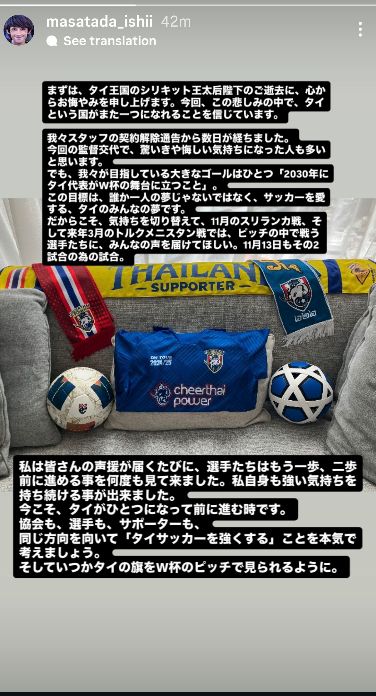 ล่าสุด อดีตกุนซือวัย 57 ปี ได้โพสต์ข้อความผ่าน Instagram Story (@masatada_ishii) ด้วยถ้อยคำเรียบง่ายแต่ทรงพลัง เขาเริ่มต้นด้วยการแสดงความเสียใจต่อการเสด็จสวรรคตของ สมเด็จพระนางเจ้าสิริกิติ์ พระบรมราชินีนาถ พระบรมราชชนนีพันปีหลวง แสดงให้เห็นถึงความเคารพและความผูกพันที่เขามีต่อประเทศไทย