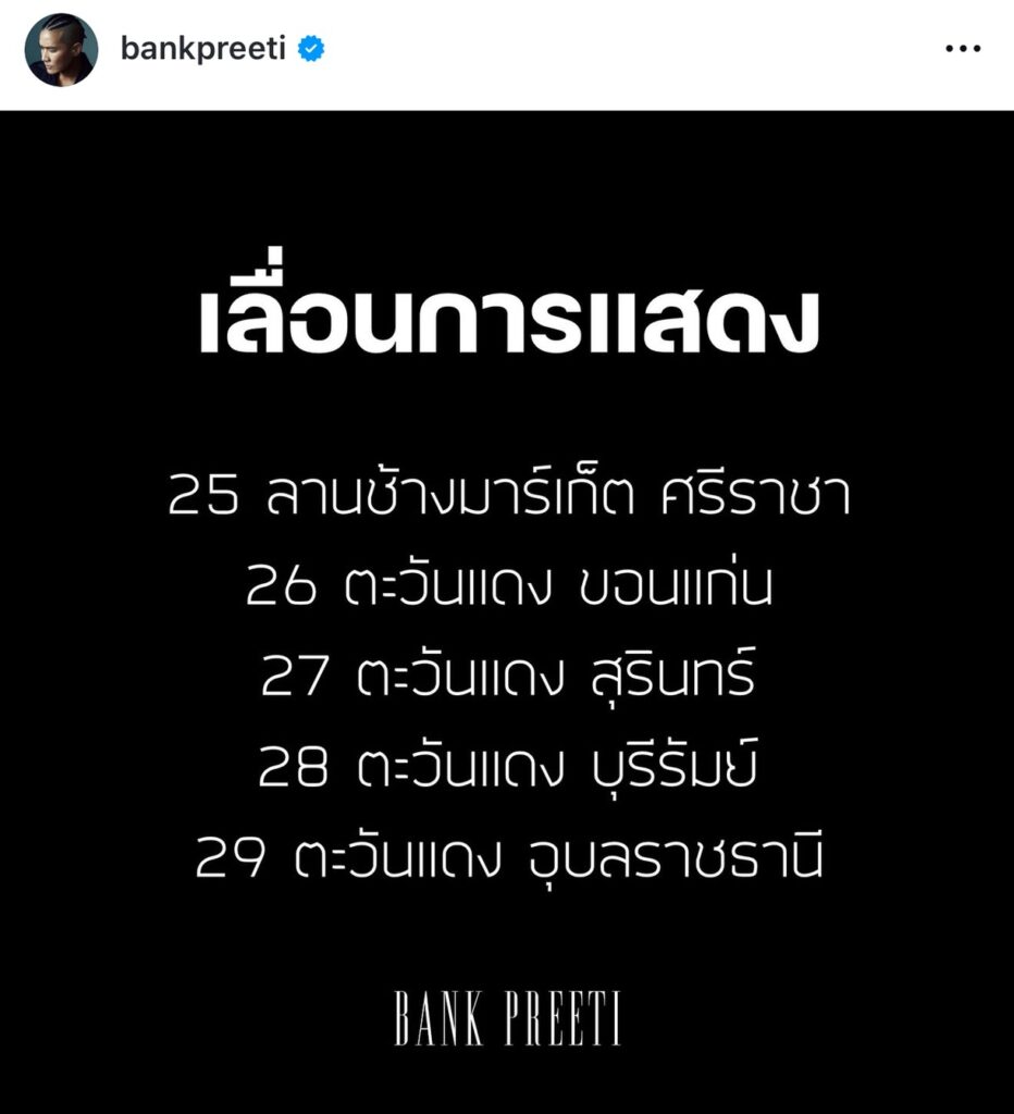 “แบงค์ ปรีติ หรือ แบงค์ วงแคลช” ได้ประกาศเลื่อนการแสดงคอนเสิร์ตที่จะมีขึ้นในเดือน ต.ค. จำนวน 5 งานออกไปก่อนยังไม่มีกำหนด โดยโพสต์ภาพ พร้อมแคปชั่นว่า “ไว้พบกันในวันที่เหมาะสมนะครับ“