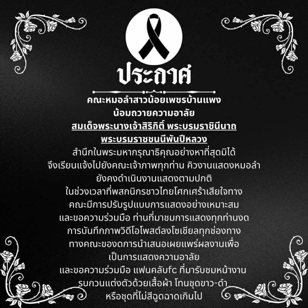 ”หมอลำคณะสาวน้อยเพชรบ้านแพง“ ได้ออกมาประกาศแจ้งให้แฟนหมอลำรับทราบคิวงานหมอลำยังคงดำเนินตามปกติ แต่คณะมีการจัดรูปแบบให้เหมาะสม โดยโพสต์ภาพข้อความว่า “หมอลำคณะสาวน้อยเพชรบ้านแพง ออกมาโพสต์น้อมถวายความอาลัย สมเด็จพระนางเจ้าสิริกิติ์ พระบรมราชินีนาถ พระบรมราชชนนีพันปีหลวง สำนึกในพระมหากรุณาธิคุณอย่างหาที่สุดมิได้ ขอความร่วมมือ ไปยังแฟนหมอลำทุกท่าน ท่านที่มารับชมผลงานการแสดง งดบันทึกภาพและวิดีโอ งดโพสต์ทั้งภาพและวิดีโอลงโซเชียลทุกช่องทาง เเละเเต่งตัวชุด ขาว-ดำ หรือสีไม่ฉูดฉาด เพื่อเป็นการแสดงความอาลัย ขอบพระคุณค่ะ 🙏🙏🙏”