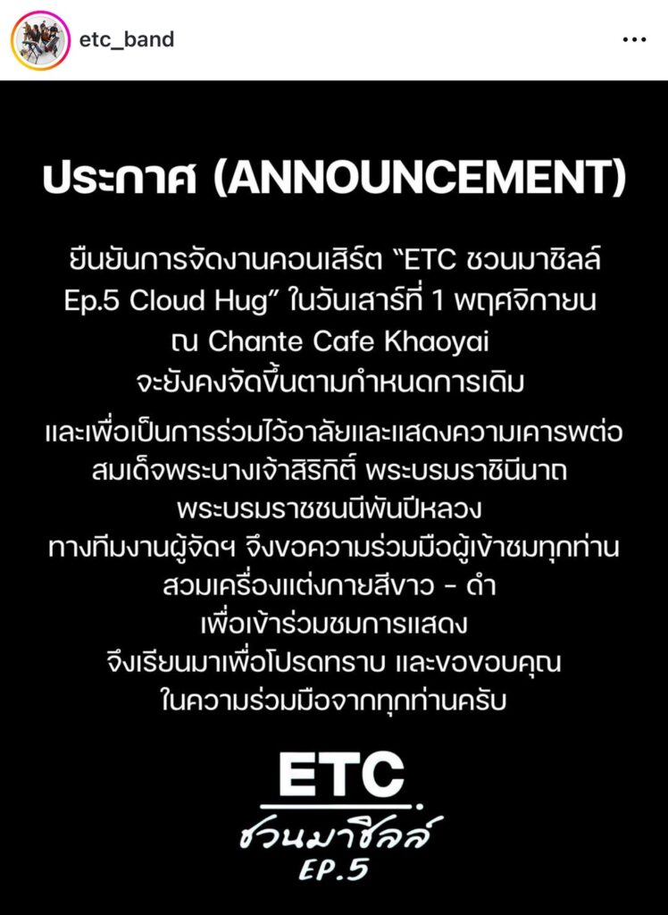“วง ETC” ได้ออกมาแจ้งขอความร่วมมือแฟนเพลงที่จะมาชมคอนเสิร์ตให้แต่งกายโทนสีขาว – ดำ โดยโพสต์ข้อความ “ยืนยันการจัดงานคอนเสิร์ต “ETC. ชวนมาชิลล์ EP.5 Cloud Hug” ในวันเสาร์ที่ 1 พฤศจิกายน ณ Chante Cafe Khaoyai ยังคงจัดขึ้นตามกำหนดการเดิมและเพื่อเป็นการถวายความอาลัยและแสดงความเคารพต่อ สมเด็จพระนางเจ้าสิริกิติ์ พระบรมราชินีนาถ พระบรมราชชนนีพันปีหลวง ผู้จัดฯ ขอความร่วมมือผู้เข้าชมทุกท่านสวมใส่เครื่องแต่งกายโทนสีขาว – ดำ เพื่อเข้าร่วมชมการแสดง จึงเรียนมาเพื่อโปรดทราบ และขอขอบคุณในความร่วมมือจากทุกท่านครับ”