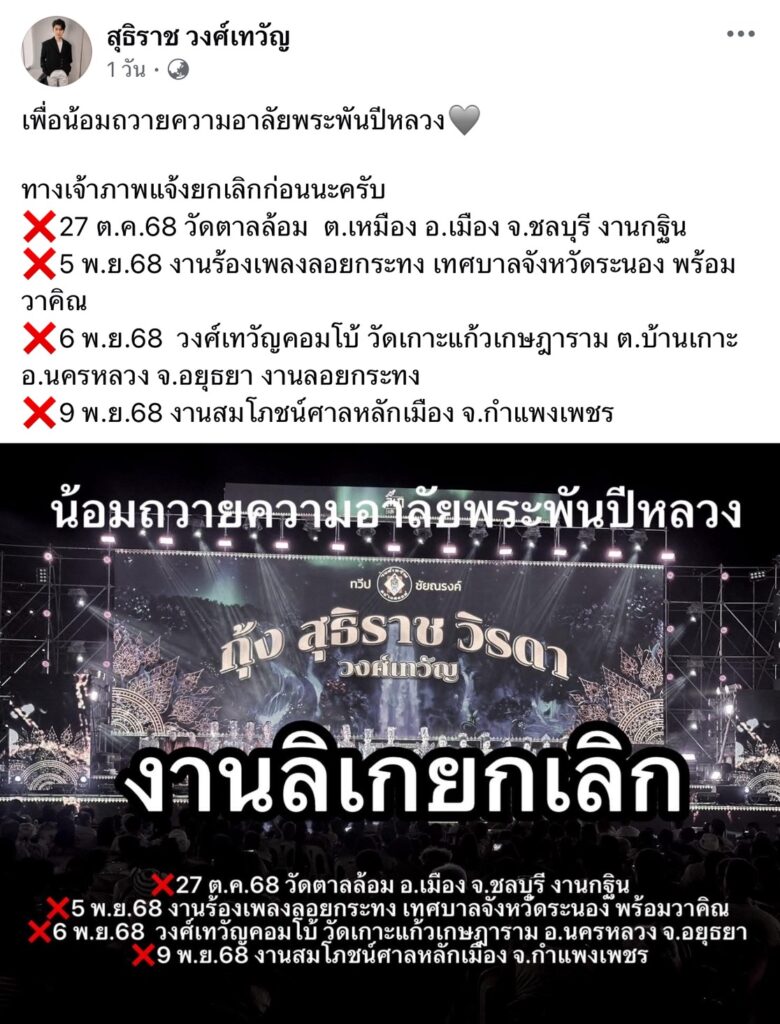 “กุ้ง สุธิราช“ ได้ออกมาประกาศการตัดสินใจยกเลิกงานลิเกอย่างชัดเจน รวมระยะเวลาเกือบสองสัปดาห์ ตั้งแต่วันที่ 27 ตุลาคม 2568 ไปจนถึงวันที่ 9 พฤศจิกายน 2568 ซึ่งรวมถึงงานสำคัญต่างๆ ทั้งงานกฐิน และงานเทศกาลลอยกระทงที่ได้รับไว้ เพื่อน้อมถวายความอาลัยพระพันปีหลวง