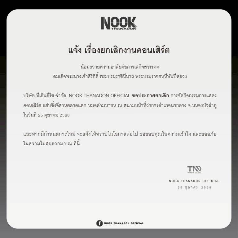 “นุ๊ก ธนดล” ที่ได้ออกมาประกาศยกเลิกงานคอนเสิร์ตเพื่อแสดงความอาลัยต่อสมเด็จพระพันปีหลวง โดยร่อนจดหมายประกาศว่า “น้อมถวายความอาลัยต่อการเสด็จสวรรคต สมเด็จพระนางเจ้าสิริกิติ์ พระบรมราชินีนาถ พระบรมราชชนนีพันปีหลวง บริษัท ทีเอ็นดีริช จำกัด, NOOK THANADON OFFICIAL ขอประกาศ ยกเลิกการจัดกิจกรรมการแสดง คอนเสิร์ต แซ่บซิ่งอีสานตลาดแตก หมอลำมหาชน ณ สนามหน้าที่ว่าการอำเภอนากลาง จ.หนองบัวลำภู และหากมีกำหนดการใหม่ จะแจ้งให้ทราบในโอกาสต่อไป ขอขอบคุณในความเข้าใจ และขออภัยในความไม่สะดวกมา ณ ที่นี้”