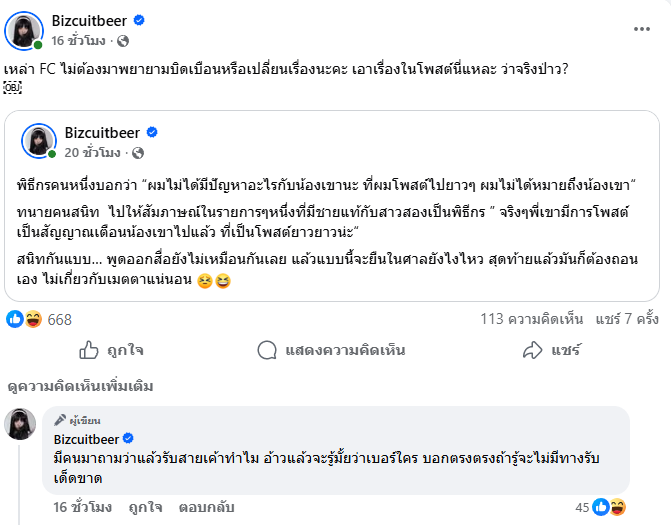 ล่าสุด “เบียร์” ได้มาโพสต์อีกว่า “สังเกตเวลาโพสต์อะไรไป ที่มีเนื้อหาข้อเท็จจริง อยู่ในนั้น