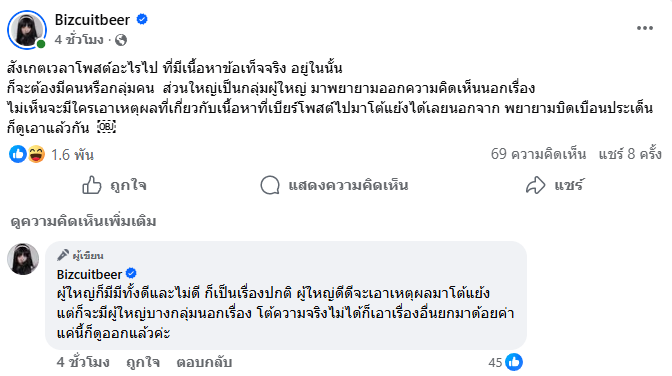 ทั้งยังคอมเมนต์อีกว่า “ผู้ใหญ่ก็มีมีทั้งดีและไม่ดี ก็เป็นเรื่องปกติ ผู้ใหญ่ดีดีจะเอาเหตุผลมาโต้แย้ง