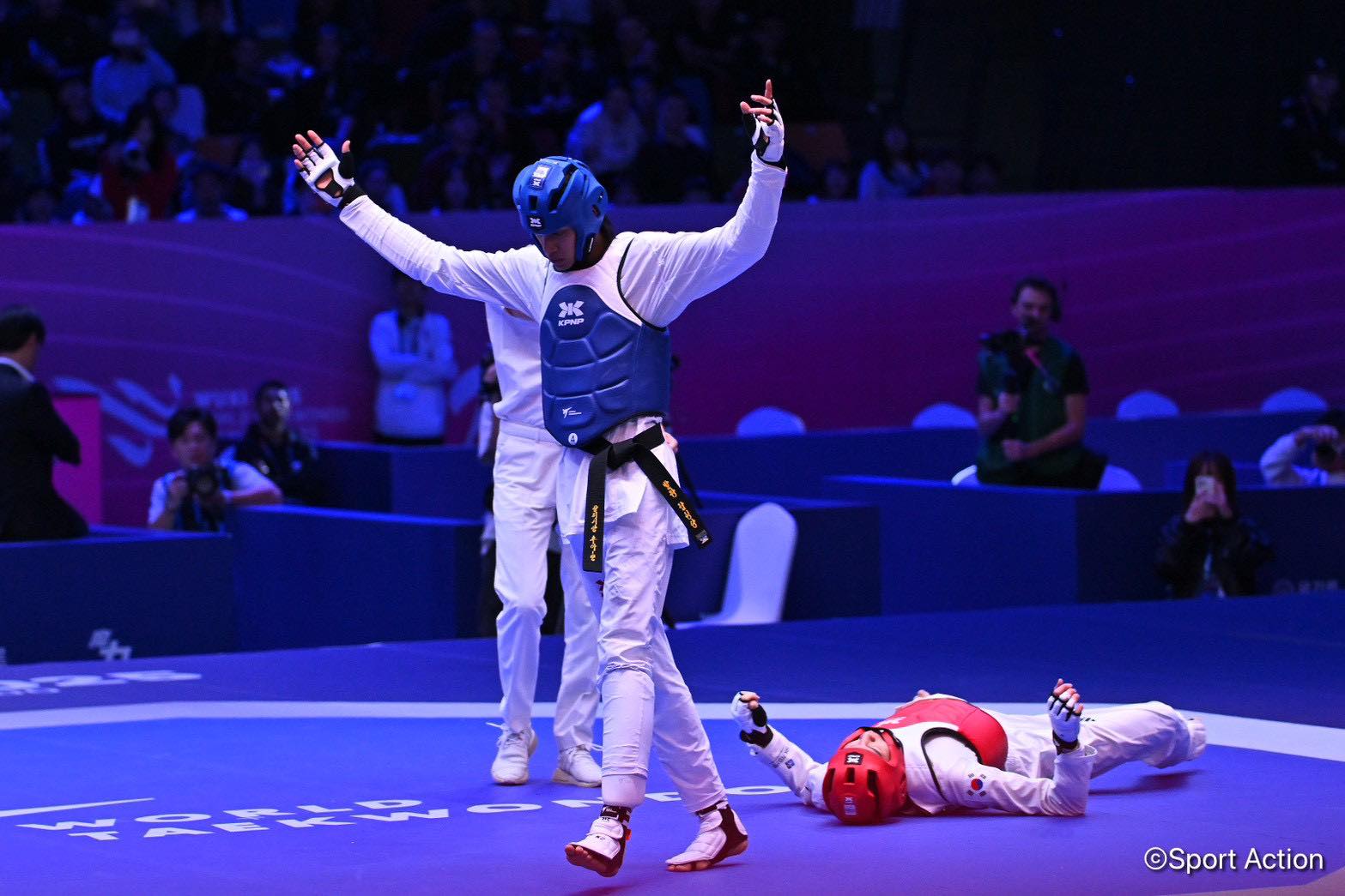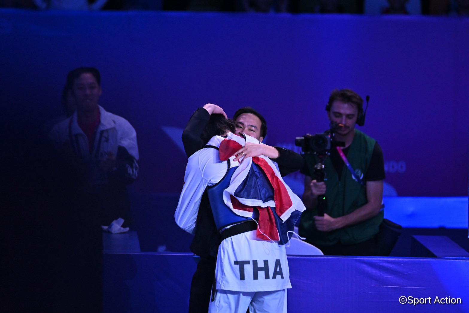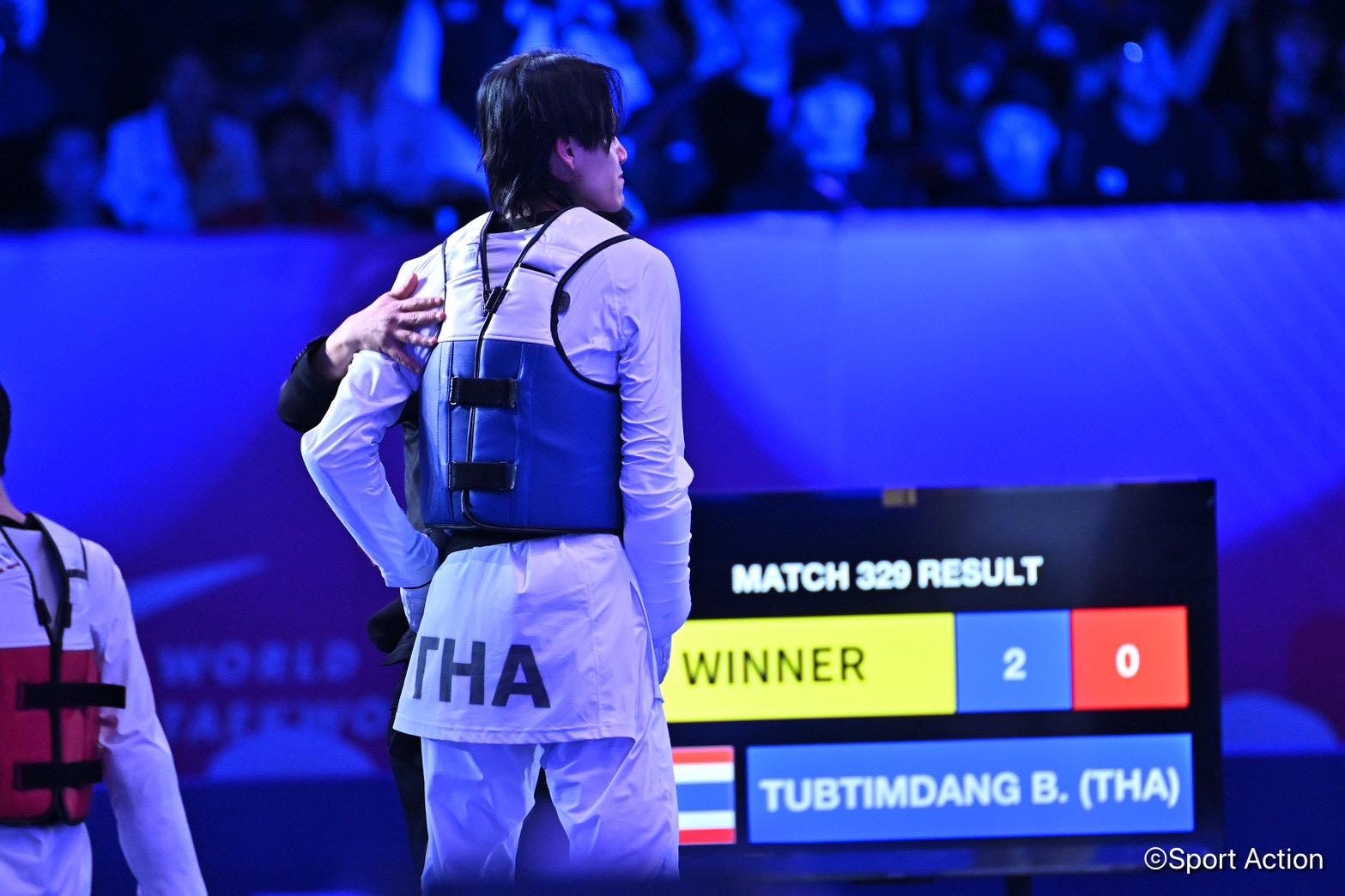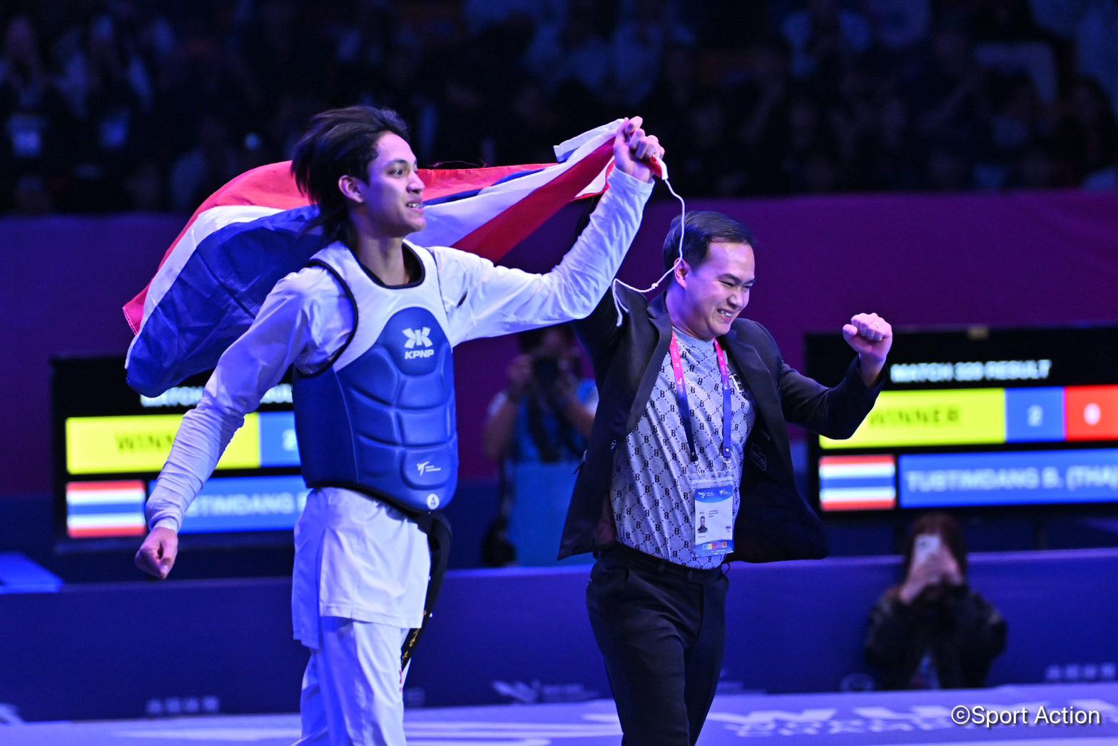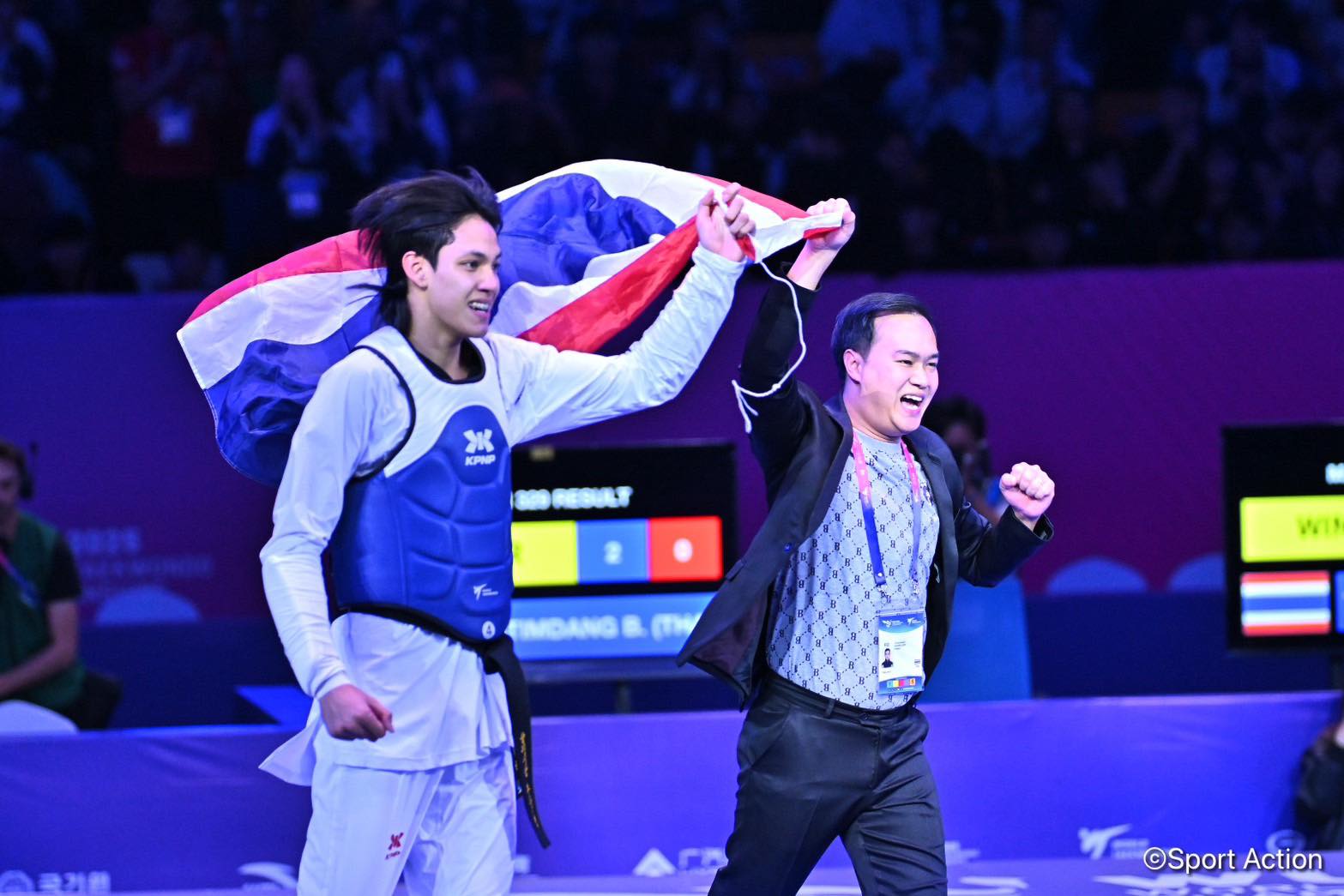 ก่อนจะมาปิดเกมในยกที่สองอย่างสวยงาม เมื่อได้แต้มจากจังหวะคู่แข่งออกนอกสนาม และตามด้วยการเตะหัว-ลำตัวอย่างแม่นยำ เอาชนะไป 7-1 คว้าเหรียญทองได้สำเร็จ