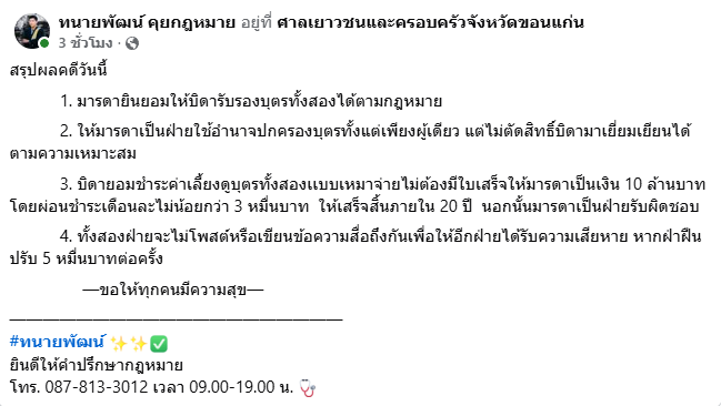 - บิดายอมชำระค่าเลี้ยงดูบุตรทั้งสองเเบบเหมาจ่ายไม่ต้องมีใบเสร็จให้มารดาเป็นเงิน 10 ล้านบาท โดยผ่อนชำระเดือนละไม่น้อยกว่า 3 หมื่นบาท ให้เสร็จสิ้นภายใน 20 ปี นอกนั้นมารดาเป็นฝ่ายรับผิดชอบ