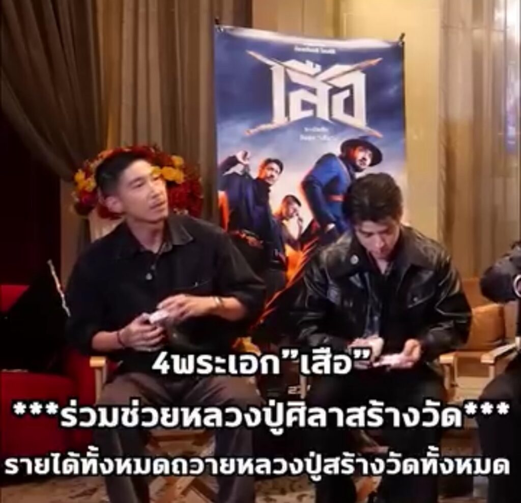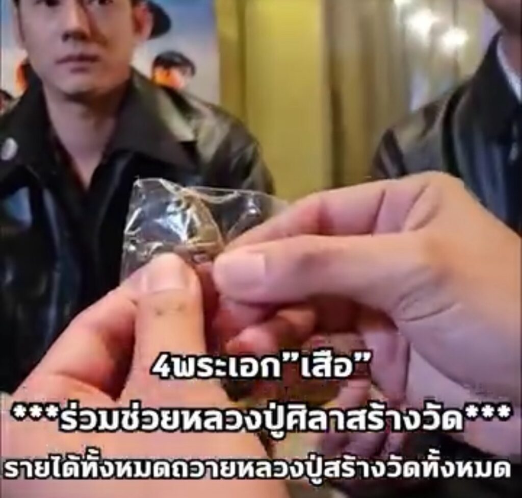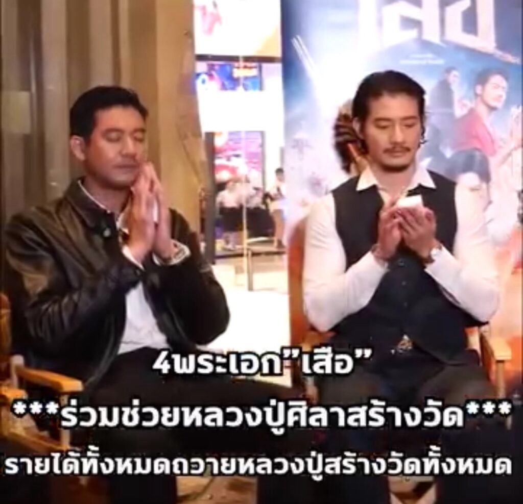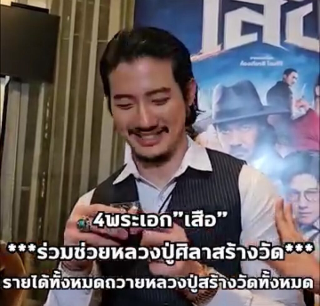 โปรยุง :เสือรุ่นแรกของพระมหาหลวงปู่ศิลาที่ผมศรัทธาขอมอบให้ พี่เวียร์ คุณเป้ คุณมาริโอ้ คุณโตโน่ อันนี้ผมขอจากคุณบุ้ง ใบหยก มาเพื่อมอบให้ 4 เสือ เพื่อเอาฤกษ์เอาชัยคนละองค์ และองค์นี้ผมจะเอาไปประมูลแล้วก็เอาเงินทั้งหมดจากการประมูล ถือว่าหนังเรื่อง เสือ ทำบุญกับหลวงปู่พระมหาศิลาร่วมกันเอาเงินทั้งหมดที่ได้จากการประมูลไปสร้างวัดทั้งหมดเลย โดยเพจของผมประมูลเองแล้วโอนเข้าที่วัดโดยตรงเลย อามือพรมนมขึ้นมาทุกคนจะนำเงินไปสร้างวัดเพื่อดํารงพุทธศาสนาให้อยู่ต่อไปร้อยปีพันปีครับ ขอให้หนังเรื่อง เสือ ทำรายได้ทะลุอย่างที่พี่โขมตั้งใจครับ เฮง เฮง เฮง ครับ