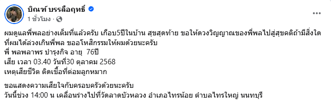 สิ้นชีพ! อดีตพระเอกดาวพระศุกร์ “บิณฑ์ บรรลือฤทธิ์” แจ้งข่าวเศร้า “พล พลากร” เสียชีวิตแล้วเนื่องจากติดเชื้อที่ต่อมลูกหมาก