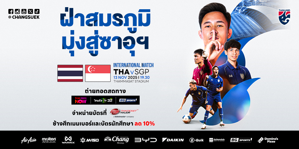 ไทย ทิคเกต เมเจอร์ เปิดจำหน่ายบัตรเข้าชมเกม “ทีมชาติไทย” ลงทำการแข่งขันฟุตบอลอุ่นเครื่อง International Exhibition Match ในวันที่ 13 พฤศจิกายน 2568 ที่จะพบกับ ทีมชาติสิงคโปร์ ณ ธรรมศาสตร์ สเตเดียม อย่างเป็นทางการเป็นที่เรียบร้อยแล้ว