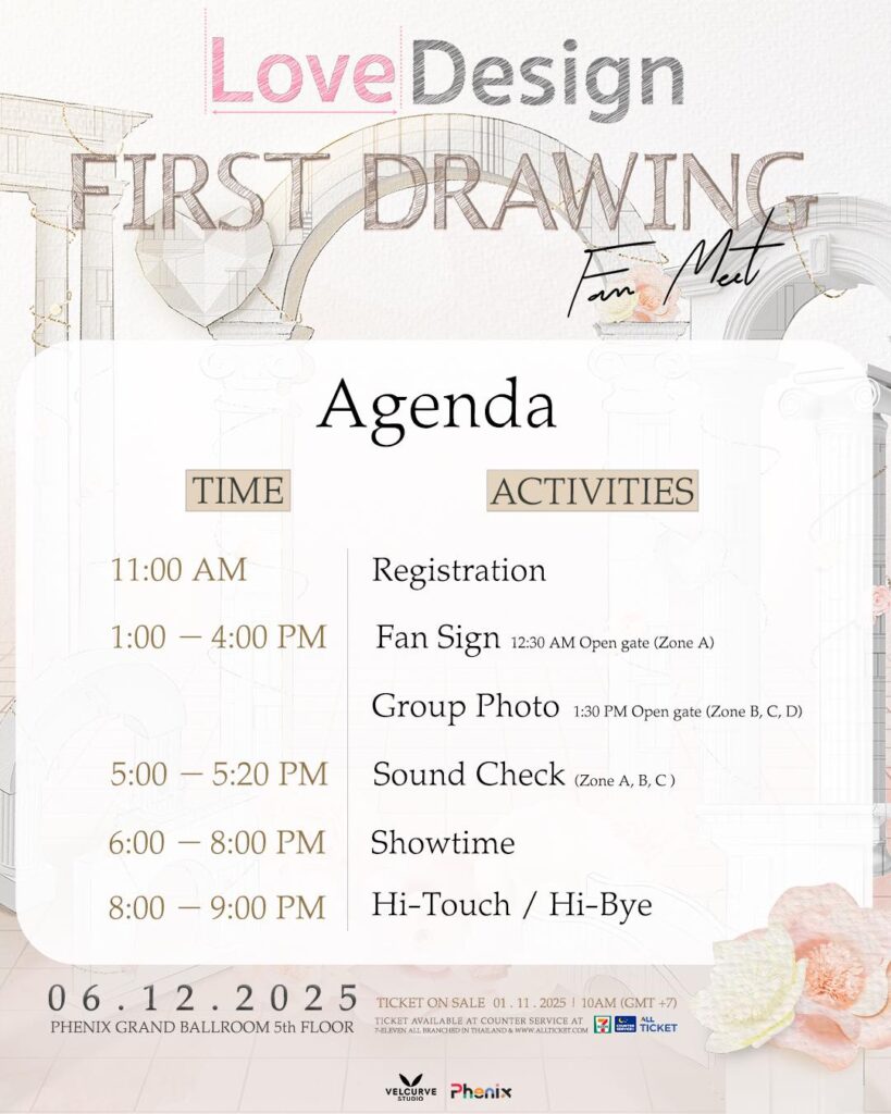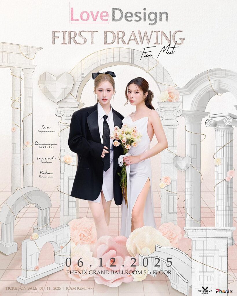 ไม่ได้มาเล่นๆก็ว่าได้ บริษัท เวลเคิร์ฟ สตูดิโอ จำกัด (VelCurve Studio) เชิญชวนแฟน ๆ ร่วมเป็นส่วนหนึ่งของงาน “LOVE DESIGN : FIRST DRAWING FAN MEETING” เตรียมตัวให้พร้อม! สัมผัสกับประสบการณ์ใหม่ๆเหนือว่าทุกงานของ “Fanmeet” ที่ไม่ใช่แค่การพบปะกับนักแสดง แต่นี่คืองานโชว์คุณภาพระดับพรีเมียม! เพื่อแฟนตัวจริงกับนักแสดงคนโปรด ในวันเสาร์ที่ 6 ธันวาคม 2025 ณ ชั้น 5 ฟีนิกซ์แกรนด์บอลรูม