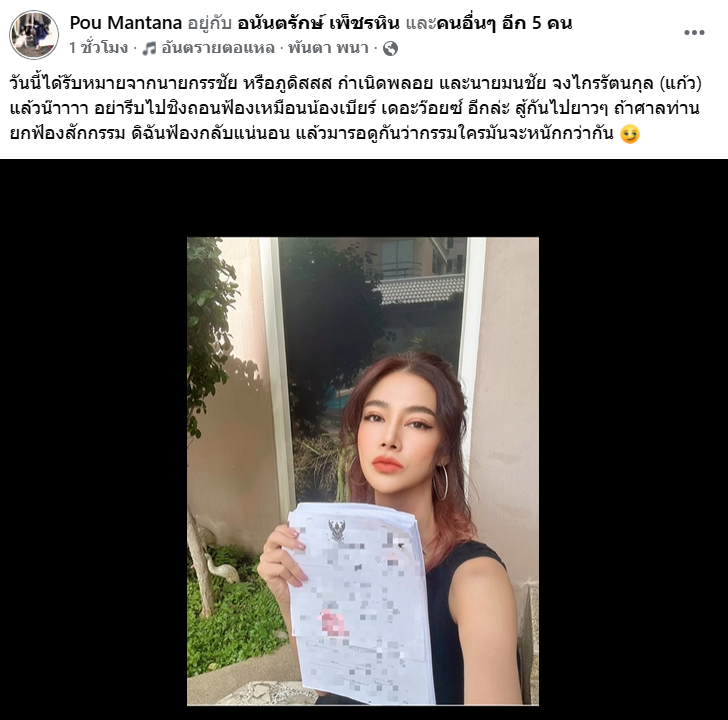 ล่าสุด “ปู” ได้หมายศาลจาก “หนุ่ม กรรชัย” โดยเธอโพสต์ข้อความว่า “วันนี้ได้รับหมายจากนายกรรชัย หรือภูดิสสส กำเนิดพลอย และนายมนชัย จงไกรรัตนกุล (แก้ว) แล้วน๊าาาา อย่ารีบไปชิงถอนฟ้องเหมือนน้องเบียร์ เดอะว๊อยซ์ อีกล่ะ สู้กันไปยาวๆ ถ้าศาลท่านยกฟ้องสักกรรม ดิฉันฟ้องกลับแน่นอน แล้วมารอดูกันว่ากรรมใครมันจะหนักกว่ากัน ”