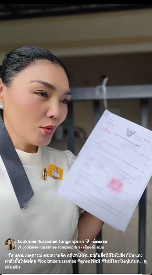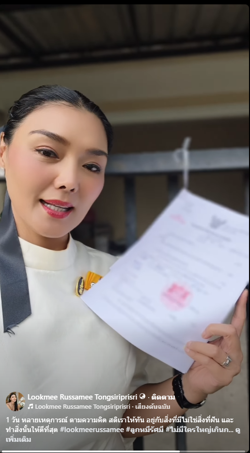 ทั้งยังเขียนแคปชั่นไว้ว่า “1 วัน หลายเหตุการณ์ ตามความคิด สติเราให้ทัน อยู่กับสิ่งที่มีไม่ใช่สิ่งที่ฝัน และทำสิ่งนั้นให้ดีที่สุด #lookmeerussamee #ลูกหมีรัศมี #ไม่มีใครใหญ่เกินกรรม #ศรีธัญญายุคใหม่ไม่บ้าก็มาได้”