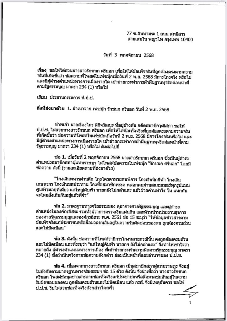ทั้งนี้ จึงขอให้ ป.ป.ช. ทำการไต่สวนนางสาวรักชนก ศรีนอก เพื่อข้อเท็จจริงที่ถูกต้องตรงตามความจริงที่เกิดขึ้นว่า ข้อความที่โพสต์ในเฟซบุ๊กเมื่อวันที่ 2 พ.ย. 2568 มีการโกงจริง หรือไม่ และมีผู้ดำรงตำแหน่งทางการเมืองรายใด เข้าข่ายกระทำการฝ่าฝืนฐานทุจริตต่อหน้าที่ตามรัฐธรรมนูญ มาตรา 234 (1) หรือไม่