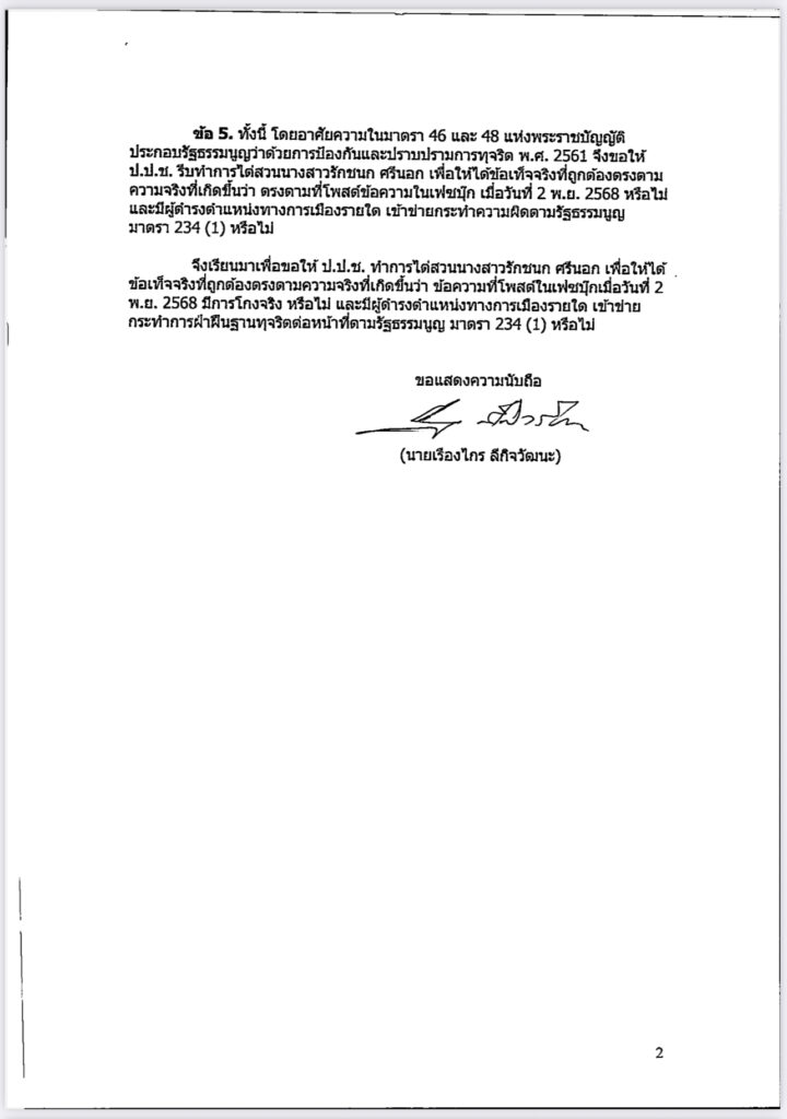ข้อ 5 ทั้งนี้ โดยอาศัยความในมาตรา 46 และ 48 แห่งพระราชบัญญัติประกอบรัฐธรรมนูญว่าด้วยการป้องกันและปราบปรามการทุจริต พ.ศ. 2561 จึงขอให้ ป.ป.ช. รีบทำการไต่สวนนางสาวรักชนก ศรีนอก เพื่อให้ได้ข้อเท็จจริงที่ถูกต้องตรงตามความจริงที่เกิดขึ้นว่า ตรงตามที่โพสต์ข้อความในเฟซบุ๊ก เมื่อวันที่ 2 พ.ย. 2568 หรือไม่ และมีผู้ดำรงตำแหน่งทางการเมืองรายใด เข้าข่ายกระทำความผิดตามรัฐธรรมนูญ มาตรา 234 (1) หรือไม่