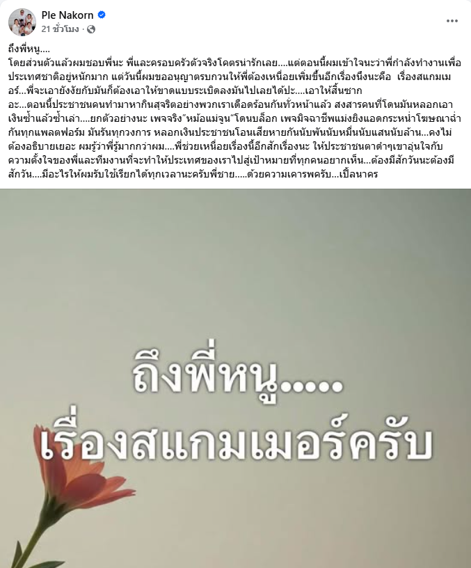 เพื่อไม่ให้คนไทยตกเป็นเหยื่อของมิจฉาชีพและสแกมเมอร์อีกต่อไป ล่าสุด “เปิ้ล” จึงได้โพสต์ข้อความฝากถึง “นายกฯ อนุทิน” ว่า “ถึงพี่หนู….