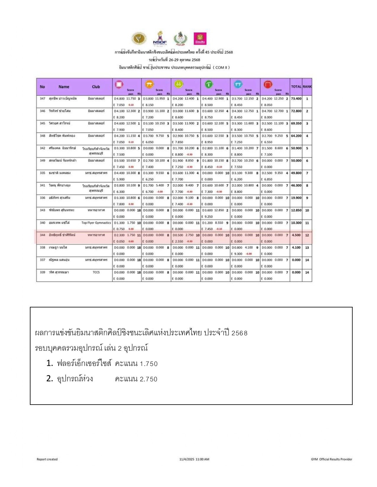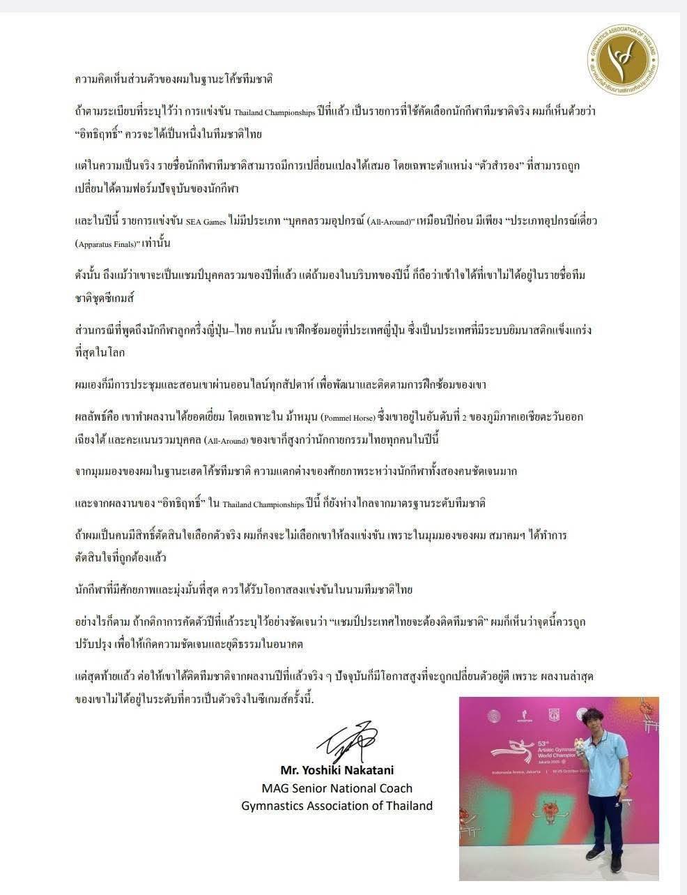 “ผลการคัดเลือกในประเด็นปัญหาของนักกีฬายิมศิลป์ชาย นายอิทธิฤทธิ์ ขำศิริรัตน์ สังกัดสโมสรทหารอากาศ ในกรณีที่ไม่ติดทีมชาติ สมาคมเคยชี้แจงกับผู้ปกครองและนักกีฬาไปแล้ว ว่าเป็นผลการแข่งขันล่าสุด ปี 2025 และตัวนักกีฬาเองก็เซ็นรับทราบแล้วตามเอกสาร”