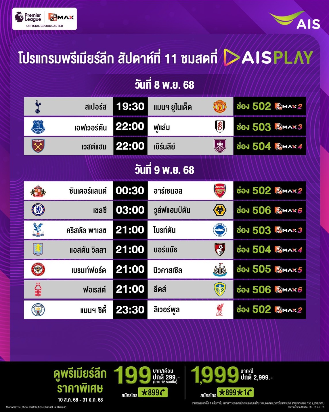 แฟนลูกหนังสามารถเชียร์ทีมรักของตัวเอง ผ่านทาง AIS PLAY ด้วย แพ็กเกจ PLAY MONOMAX Standard ราคาพิเศษ! ที่เอไอเอสเท่านั้น รายเดือนเพียง 199 บาท นาน 12 รอบบิล (ปกติ 299 บาท) สมัครกด *899 โทรออก หรือคลิก https://m.ais.co.th/PLmapfb หรือรายปีสุดคุ้ม 1,999 บาท (ปกติ 2,999 บาท) สมัครกด *899*1 โทรออก หรือคลิก https://m.ais.co.th/PLyapfb ตั้งแต่ 10 สิงหาคม 2568 – 31 ธันวาคม 2568