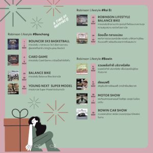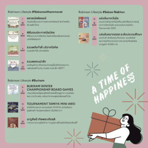โรบินสันไลฟ์สไตล์ทุกสาขาทั่วประเทศ ขอเชิญทุกท่านมาร่วมแบ่งปันช่วงเวลาแห่งการให้ไปด้วยกัน ผ่านกิจกรรมสร้างสรรค์หลากหลายรูปแบบ ที่ตอบโจทย์ทุกไลฟ์สไตล์ของทุกคนในครอบครัว อาทิ
