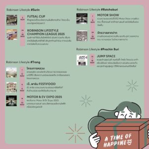 22 พ.ย. 68 – 23 พ.ย. 68 ร่วมส่งต่อความสุขผ่านกิจกรรม Robinson Lifestyle Balance Bike การแข่งขันจักรยานขาไถสุดน่ารักสำหรับน้อง ๆ หนู ๆ ที่จะได้มาประลองความเร็วและความมั่นใจในสนาม พร้อมรับถ้วยรางวัลและของที่ระลึกมากมาย