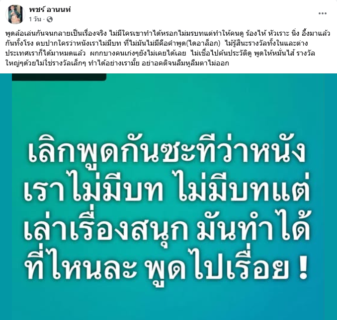 ทั้งนี้เขายังได้ระบุแคปชั่นด้วยว่า “พูดล้อเล่นกันจนกลายเป็นเรื่องจริง ไม่มีใครเขาทำได้หรอกไม่มรบทแต่ทำให้คนดู ร้องไห้ หัวเราะ นิ่ง อึ้งมาแล้ว กันทั้งโรง ตบปากใครว่าหนังเราไม่มีบท ที่ไม่มันไม่มีคือคำพูด(ไดอาล็อก) ไม้รู้สินะรางวัลทั้งในและต่างประเทศเราก็ได้มาหมดแล้ว ผกกบางคนเก่งๆยังไม่เคยได้เลย ไม่เชื่อไปค้นประวัติดู พูดให้หมั่นไส้ รางวัลใหญ่ๆด้วยไม่ใช่รางวัลเล็กๆ ทำได้อย่างเรามั้ย อย่าอคติจนลืมหูลืมตาไม่ออก”