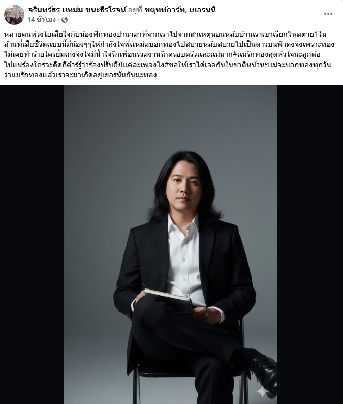ล่าสุด “แหม่ม” ได้โพสต์รูปภาพลูกชายพร้อมระบุข้อความว่า “หลายคนห่วงใยเสียใจกับน้องฟักทองปานามาที่จากเราไปจากสาเหตุนอนหลับบ้านเราเขาเรียกไหลตาย1ในล้านที่เสียชิวิตเเบบนี้มีน้องๆๆให้กำลังใจพี่เเหม่มบอกทองไปสบายหลับสบายไปเป็นดาวบนฟ้าคงจิงเพราะทองไม่เคยทำร้ายใครยิ้มเก่งจิงใจมีน้ำใจรักเพื่อนร่วมงานรักครอบครัวเเละเเม่มาก#เเม่รักทองสุดหัวใจนะลูกต่อไปเเม่ร้องใครจะดีดกีต้าร์รู้ว่าร้องปรับคีย์เเค่ละเพลงไง#ขอให้เราได้เจอกันในชาติหน้านะเเม่จะบอกทองทุกวันว่าเเม่รักทองเเล้วเราจะมาเกิดอยู่เยอรมันกันนะทอง”