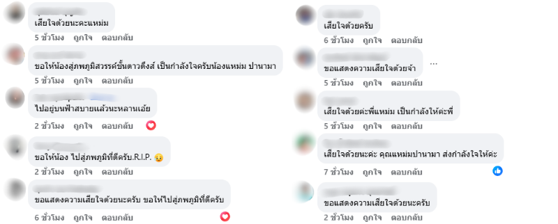 จากโพสต์ดังกล่าวทางด้านแฟนคลับได้เข้ามาคอมเมนต์แสดงความเสียใจและไว้อาลัยอย่างมากมาย