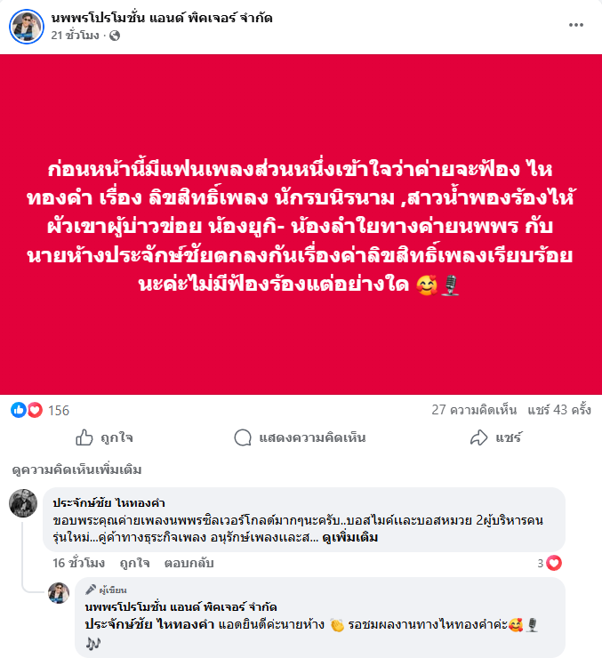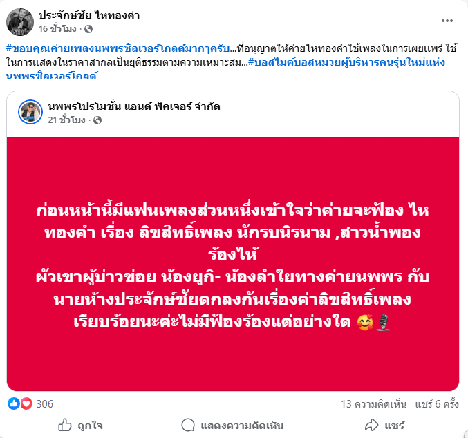 และได้แชร์โพสต์ดังกล่าวพร้อมระบุข้อความเพิ่มเติมว่า “#ขอบคุณค่ายเพลงนพพรซิลเวอร์โกลด์มากๆครับ…ที่อนุญาตให้ค่ายไหทองคำใช้เพลงในการเผยเเพร่ ใช้ในการเเสดงในราคาสากลเป็นยุติธรรมตามความเหมาะสม…#บอสไมค์บอสหมวยผู้บริหารคนรุ่นใหม่เเห่งนพพรซิลเวอร์โกลด์”