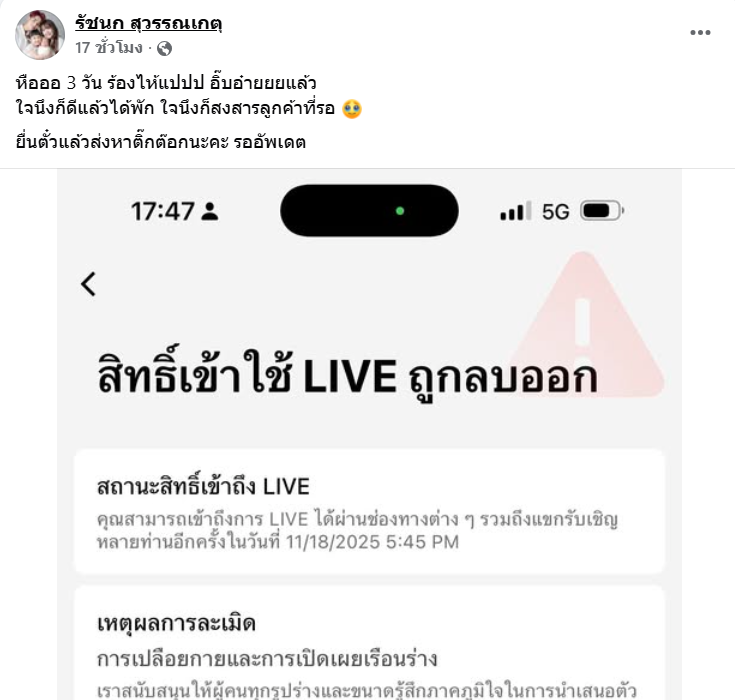 “เจนนี่ รัชนก” ทำผิดกฏโดนบล็อก 3 วัน ล่าสุดกลับมาไลฟ์ได้แล้ว