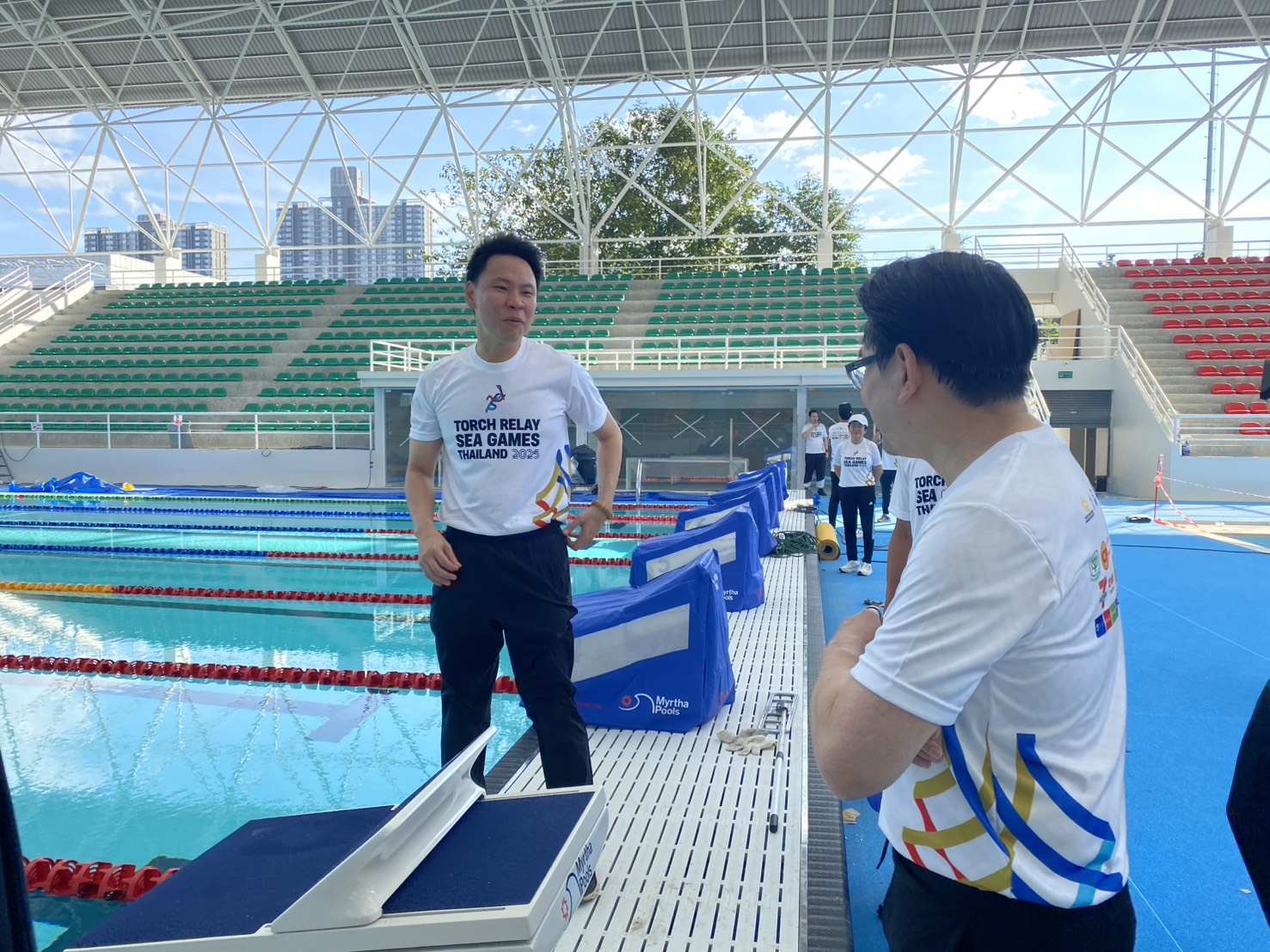 นายอรรถกร ศิริลัทธยากร รัฐมนตรีว่าการกระทรวงการท่องเที่ยวและกีฬา พร้อมด้วย ดร.ก้องศักด ยอดมณี ผู้ว่าการการกีฬาแห่งประเทศไทย ได้มาสำรวจความพร้อมของ สระว่ายน้ำ กกท. ที่มีความจุ 3,000 ที่นั่ง ซึ่งเป็นสังเวียนในการแข่งขันว่ายน้ำซีเกมส์ ครั้งที่ 33 ที่ไทยเป็นเจ้าภาพ โดยมี “โค้ชตึก” นายธนาวิชญ์ โถสกุล เลขาธิการสมาคมกีฬาทางน้ำแห่งประเทศไทย ให้การต้อนรับ