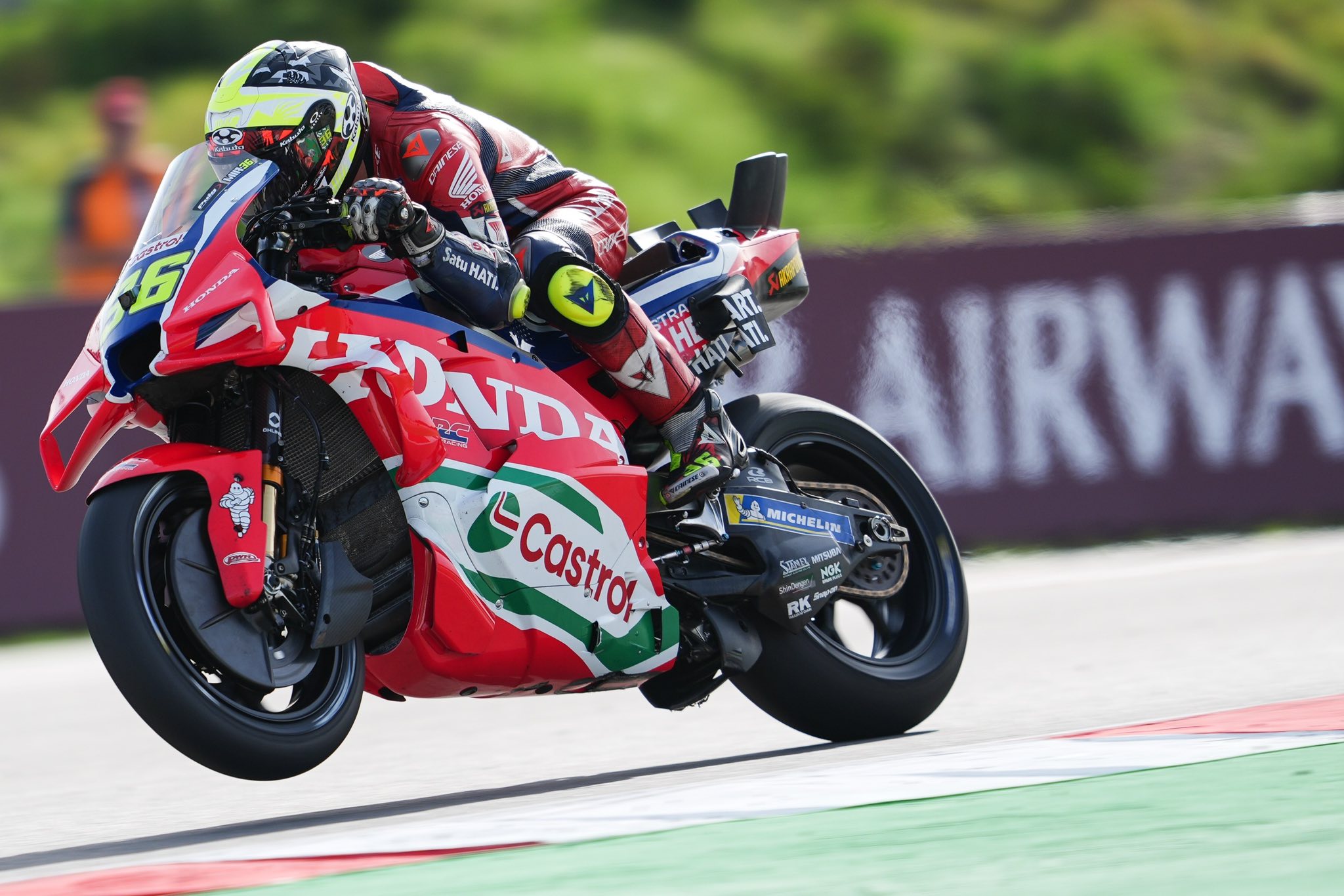 ผลการซ้อมปรากฏว่า “โจอัน เมียร์” หมายเลข36 อดีตแชมป์โลก โมโตจีพี 2020 จาก ฮอนด้า เอชอาร์ซี กลับมาอยู่ในฟอร์มที่ดีอีกครั้ง จบวันแรกด้วยการรั้งอันดับ 9 ตามหลังผู้นำเพียง 0.394 วินาที สามารถผ่านเข้าสู่การควอลิฟายรอบ Q2 ได้แบบอัตโนมัติ ส่วน “ลูก้า มารินี” ทีมเมทชาวอิตาเลียนหมายเลข 10 รั้งอันดับ 16 ตามหลัง 0.656 วินาที