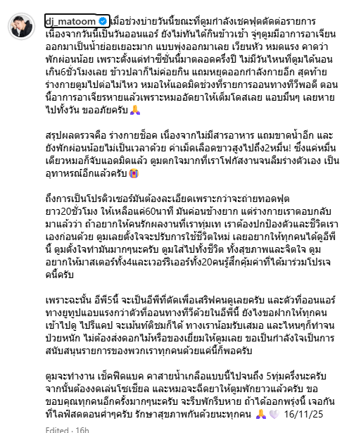 โดยล่าสุด “ดีเจมะตูม” โพสต์รูปภาพขณะอยู่ที่โรงพยาบาลและเผยว่า “เมื่อช่วงบ่ายวันนี้ขณะที่ตูมกำลังเชคฟุตตัดต่อรายการเนื่องจากวันนี้เป็นวันออนแอร์ ยังไม่ทันได้กินข้าวเช้า จู่ๆตูมมีอาการอาเจียนออกมาเป็นน้ำย่อยเยอะมาก แบบพุ่งออกมาเลย เวียนหัว หมดแรง คาดว่าพักผ่อนน้อย เพราะตั้งแต่ทำซีซั่นนี้มาตลอดครึ่งปี ไม่มีวันไหนที่ตูมได้นอนเกิน6ชั่วโมงเลย ข้าวปลาก็ไม่ค่อยกิน แถมหยุดออกกำลังกายอีก สุดท้ายร่างกายตูมไปต่อไม่ไหว หมอให้แอดมิดช่วงที่รายการออนทางทีวีพอดี ตอนนี้อาการอาเจียรหายแล้วเพราะหมออัดยาให้เต็มโดสเลย แอบมึนๆ เลยหายไปทั้งวัน ขออภัยครับ🙏