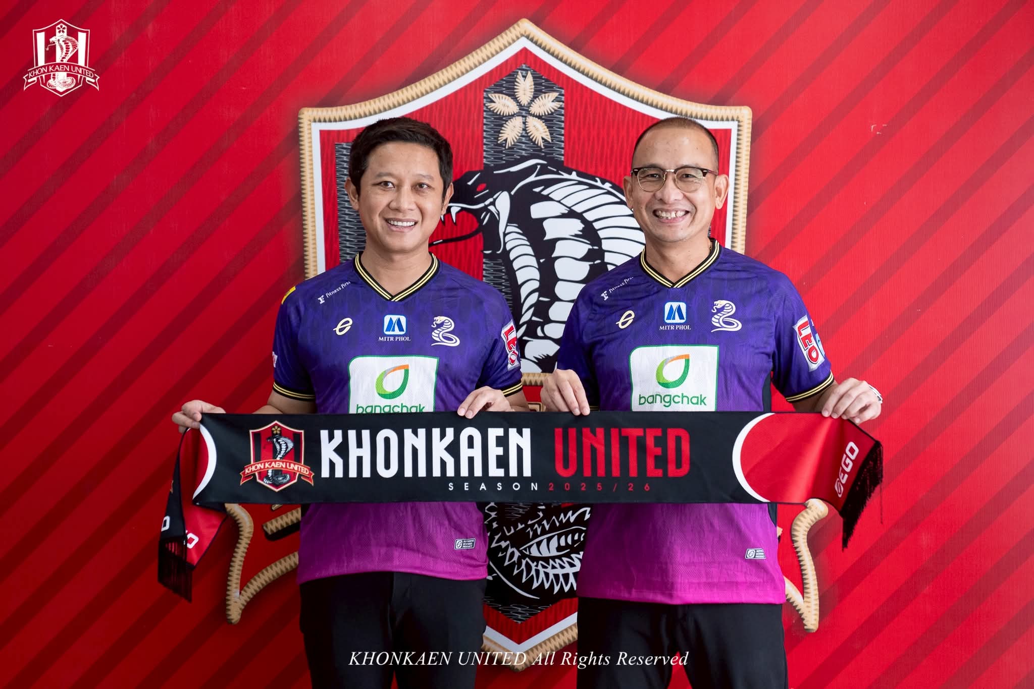 “โค้ชโจ” ธีระศักดิ์ โพธิ์อ้น ชูผ้าพันคอคู่กับ ”นายกต้อม“ วัฒนา ช่างเหลา ประธานที่ปรึกษาฯ รับตำแหน่งกุนซือทีม ขอนแก่น ยูไนเต็ด ทีมจากไทยลีก 2 คนใหม่