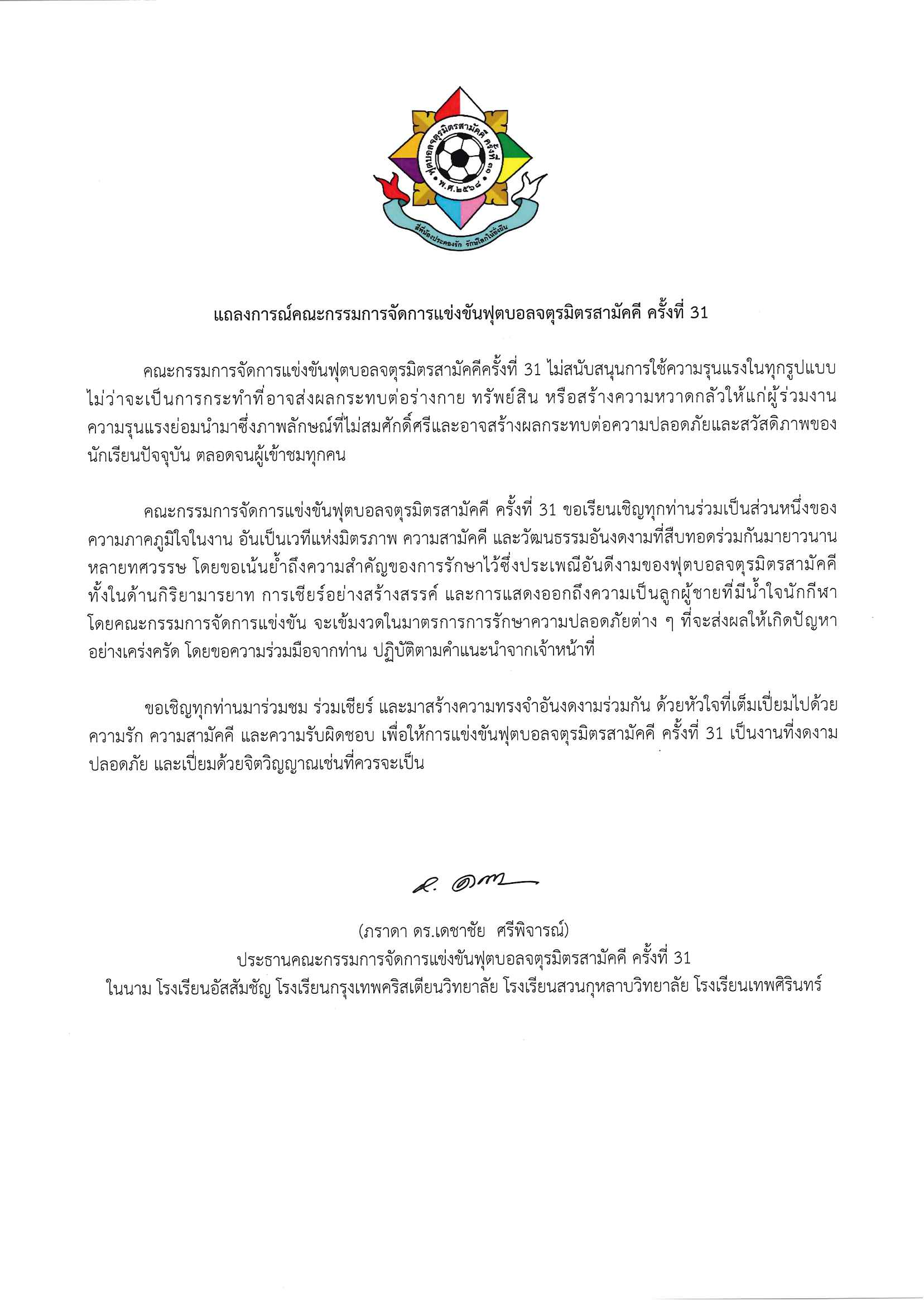 แถลงการณ์คณะกรรมการจัดการแข่งขันฟุตบอลจตุรมิตรสามัคคี ครั้งที่ 31