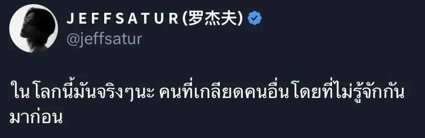 ต่อมาทางด้าน ”เจฟ ซาเตอร์“ ก็ได้ออกมาเคลื่อนไหวโพสต์ข้อความสั้นๆ ”ในโลกนี้มีคนประเภทที่เกลียดคนอื่นทั้งที่ยังไม่เคยรู้จักกันมาก่อนอยู่จริง ๆ“ โดยโพสต์นี้ไม่รู้ว่าหนุ่ม ”เจฟ“ จะโพสต์ถึงใครไหม หรือเกี่ยวกับประเด็นดราม่าไหม หรือจะโพสต์ลอยๆ ก็ต้องรอเจ้าตัวพูดเอง