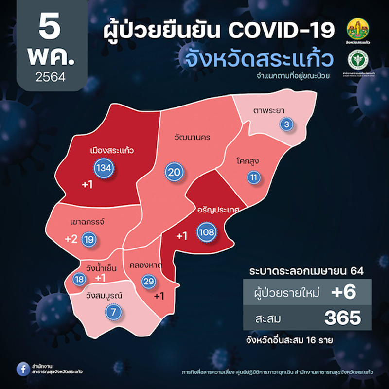 สระแก้วติดเชื้อ 6 ราย ติดเชื้อสะสม 365 ราย ผู้ว่าฯ ออกคำสั่งห้ามออกนอกเคหสถานเที่ยงคืนถึงตี 4