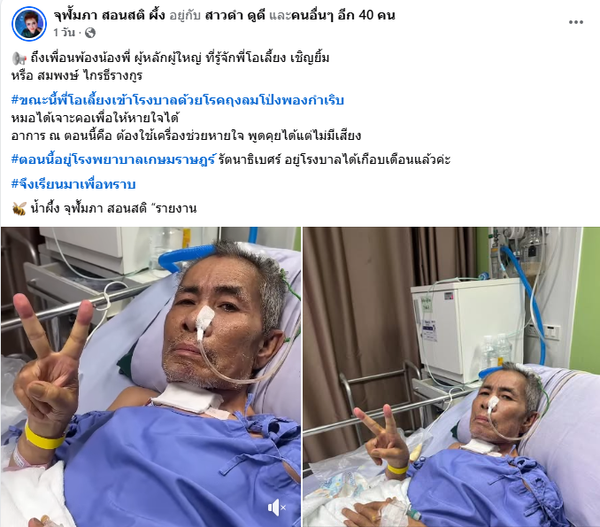 #ขณะนี้พี่โอเลี้ยงเข้าโรงบาลด้วยโรคถุงลมโป่งพองกำเริบ หมอได้เจาะคอเพื่อให้หายใจได้ อาการ ณ ตอนนี้คือ ต้องใช้เครื่องช่วยหายใจ พูดคุยได้แต่ไม่มีเสียง #ตอนนี้อยู่โรงพยาบาลเกษมราษฎร์ รัตนาธิเบศร์ อยู่โรงบาลได้เกือบเดือนแล้วค่ะ #จึงเรียนมาเพื่อทราบ นํ้าผึ้ง จุฬัมภา สอนสติ “รายงาน”