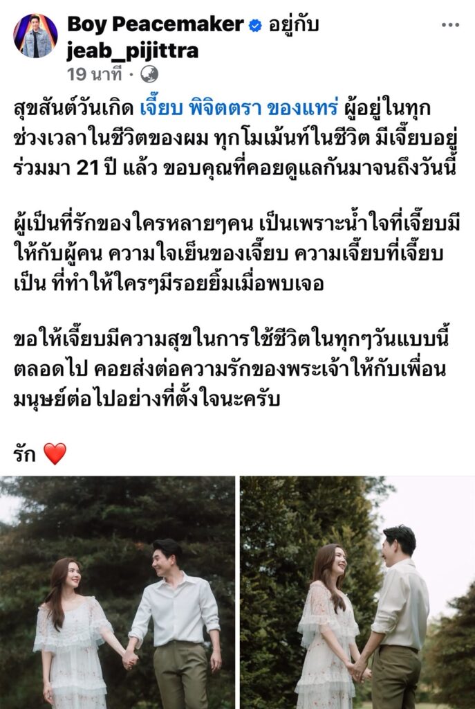 โมเมนต์เรียบง่ายแต่ชัดเจนในความหมาย “ขอบคุณที่อยู่ข้างกันในทุกช่วงเวลาของชีวิต” ทำแฟนๆ อบอุ่นหัวใจจนแห่เข้ามากดไลก์กันล้นหลาม เป็นอีกหนึ่งโมเมนต์น่ารักอบอุ่นของคู่รักขวัญใจแฟนๆ เมื่อ บอย อนุวัฒน์ (บอย พีซเมคเกอร์) โพสต์อวยพรวันเกิดให้ภรรยา เจี๊ยบ พิจิตตรา ผ่านอินสตาแกรมส่วนตัว ด้วยข้อความเรียบง่ายแต่เปี่ยมด้วยความหมายลึกซึ้ง เปรียบเธอเป็น “คู่ชีวิตที่เป็นมากกว่าคู่ชีวิต” คู่ที่เติบโต เคียงข้าง และเติมเต็มกันมาตลอดหลายปี