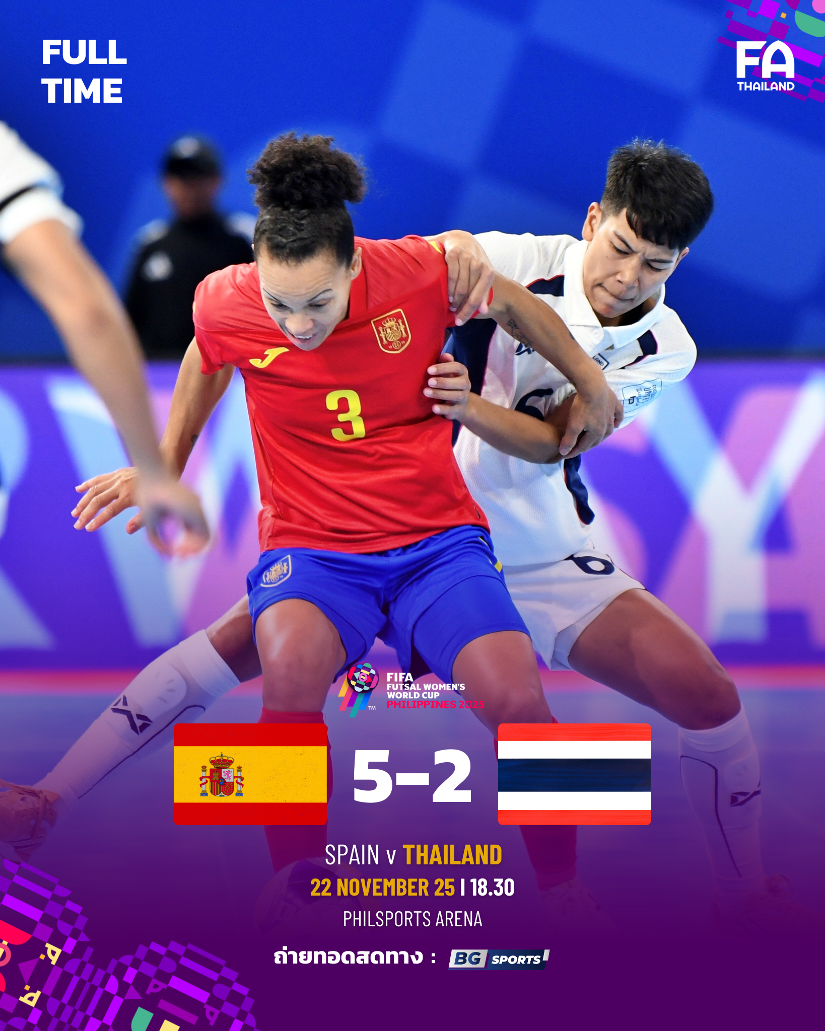 วันที่ 22 พฤศจิกายน 2568 เวลา 18.30 น. ตามเวลาประเทศไทย ณ ฟิลสปอร์ตส์ อารีนา, กรุงมะนิลา ประเทศฟิลิปปินส์ การแข่งขันฟุตซอลหญิงชิงแชมป์โลก 2025 กลุ่มบี นัดแรก ฟุตซอลหญิงทีมชาติไทย ทีมอันดับ 4 ของโลก พบกับ สเปน ทีมอันดับ 2 ของโลก