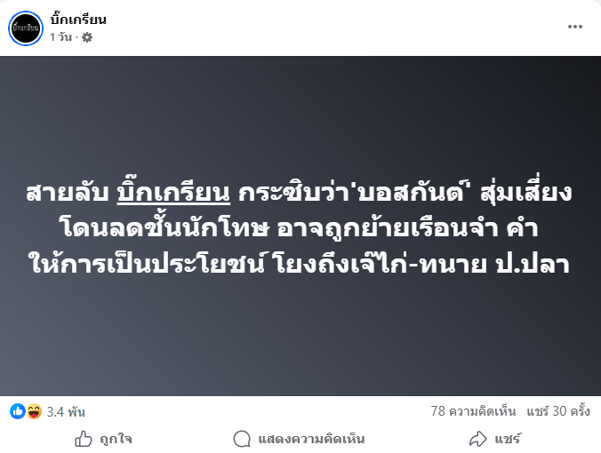 และต่อมาได้โพสต์ต่ออีกว่า “สายลับ บิ๊กเกรียน กระซิบว่า‘บอสกันต์‘ สุ่มเสี่ยงโดนลดชั้นนักโทษ อาจถูกย้ายเรือนจำ คำให้การเป็นประโยชน์ โยงถึงเจ๊ไก่-ทนาย ป.ปลา”