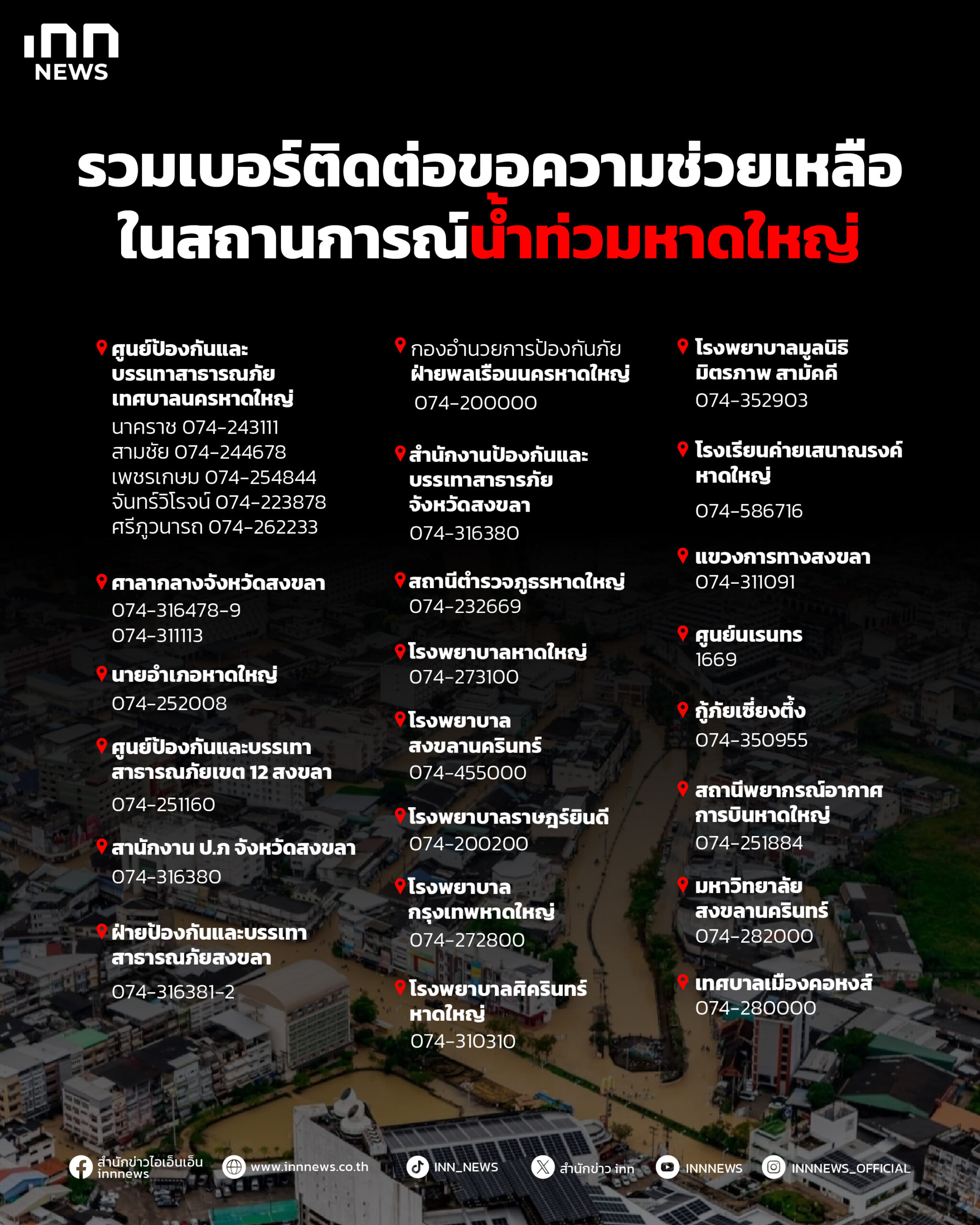 รวมเบอร์ติดต่อขอความช่วยเหลือในสถานการณ์น้ำท่วมหาดใหญ่