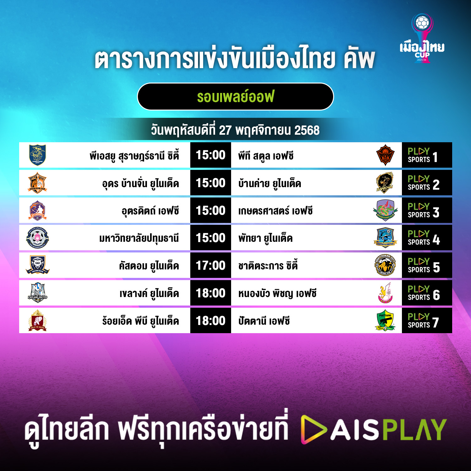 โปรแกรมการแข่งขันฟุตบอลเมืองไทย คัพ 2025/26 รอบเพลย์ออฟ มีดังนี้