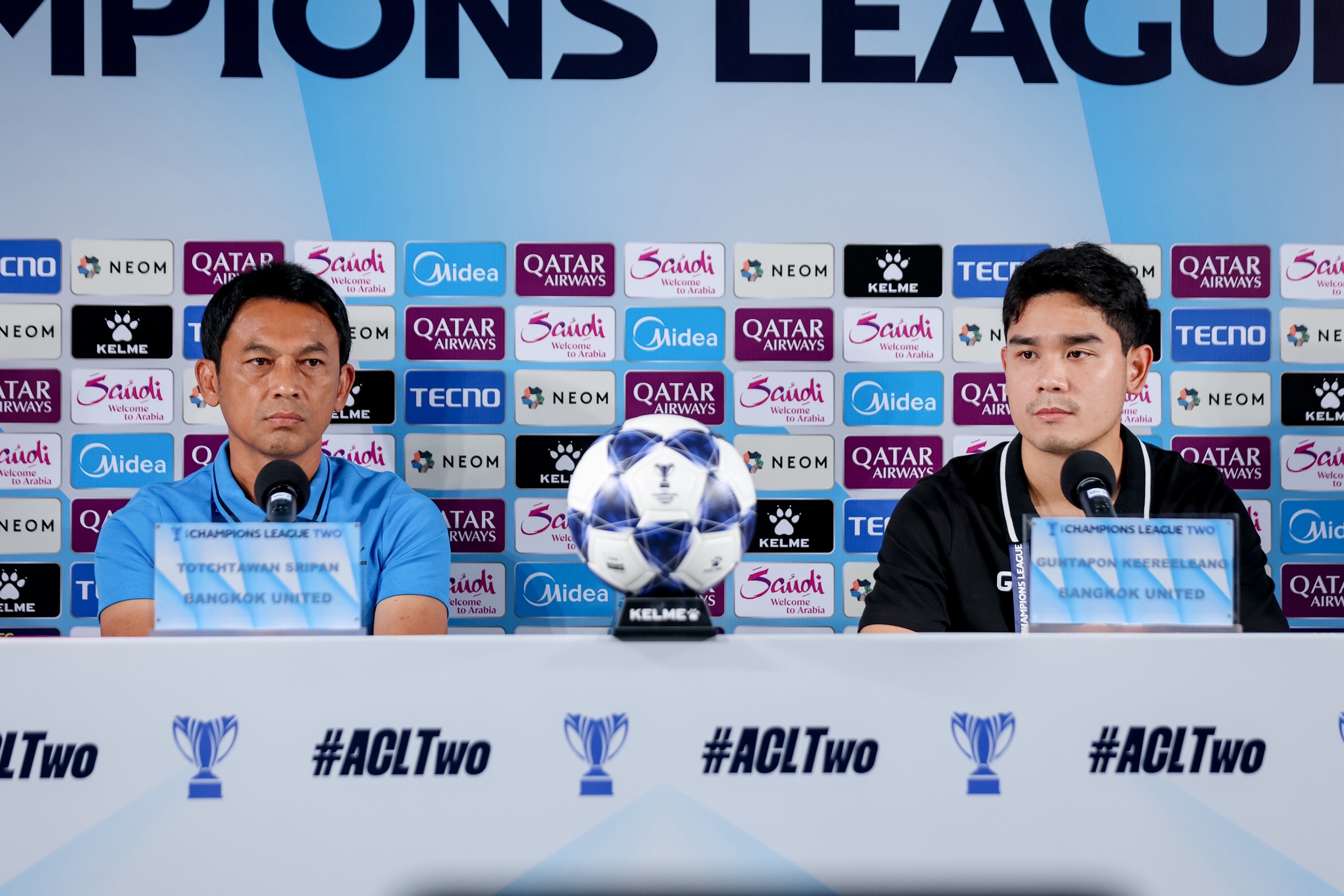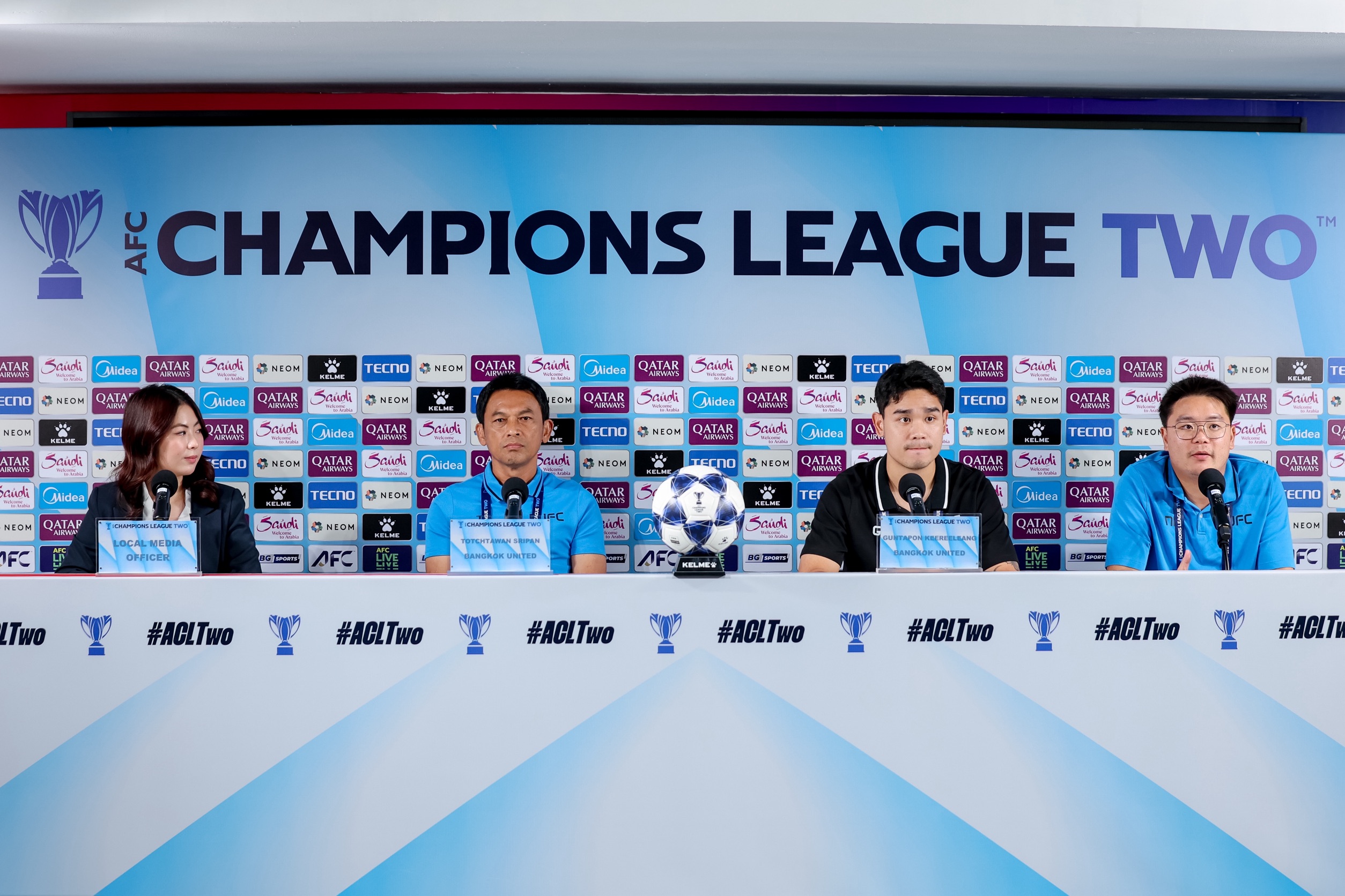 ณ ห้องแถลงข่าวสนาม ทรู บีจี สเตเดี้ยม “โค้ชแบน” ธชตวัน ศรีปาน และ กัณตภณ คีรีแลง ร่วมแถลงข่าว การแข่งขัน ฟุตบอลเอเอฟซี แชมเปียนส์ ลีก ทู 2025/26 รอบแบ่งกลุ่ม กลุ่มจี นัดที่ห้า พบ เซลังงอร์ เอฟซี ในวันพรุ่งนี้