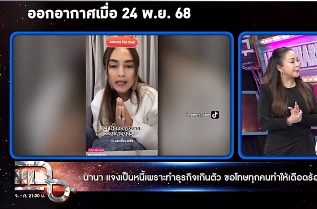ล่าสุดทางด้าน ”ดีเจดาด้า“ ได้ออกมาเปิดเผยผ่านรายการแฉว่า ”มีนัดคุยเพื่อเคลียร์กัน ยอมรับว่าช็อกเมื่อรู้ความจริง ซึ่งนานาก็ยอมรับว่าทำอะไรบ้าง ระยะเวลาในการมีปัญหา3ปีที่ผ่านมาแต่ว่าหนักในช่วง2ปี และหนักสุดๆต้นปี โดยทางนานา ก็ทำธุรกิจหลากหลาย ก็ขาดทุน เผยที่รับรู้ตอนแรกไม่ค่อยเชื่อเลย เพราะว่าสิ่งที่เรารับรู้มาตลอด2ปี มันเป็นอีกสตอรี่หนึ่ง รู้ว่าเขาเป็นหนี้ และเข้าใจว่าเขามีเจ้าหนี้แค่คนเดียว แจงความรู้สึกเพื่อนที่คบกันมา30ปี ไม่โกธร ไม่เกลียด แต่มันอึ้ง ส่วนจะเอาผิดไหม บอกเลยว่าไม่เอาผิด เพราะเห็นแก่หลาน อยากให้โอกาสพื้นที่เขา เราไปคั่นให้เขาตาย เราก็ไม่ได้เงิน ให้พื้นที่เขาสำนึกผิดว่าทำแบบนี้มันไม่ถูกต้อง ให้เขาทำงานแล้วมาชดใช้หนีให้กับเพื่อนๆ“