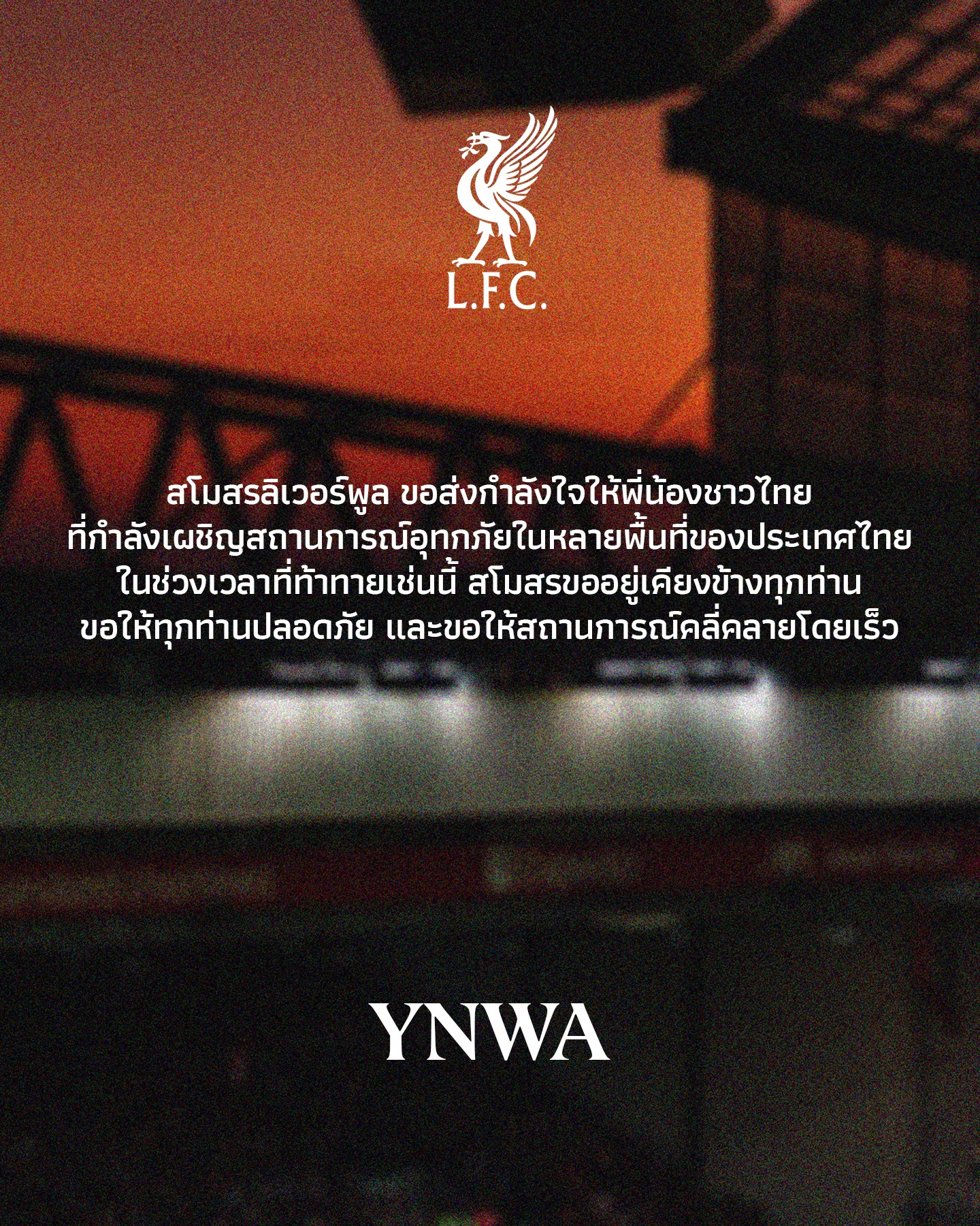 ลิเวอร์พูล โพสต์ข้อความผ่านโซเชียลสโมสร ระบุว่า “สโมสรลิเวอร์พูลขอส่งกำลังใจถึงพี่น้องชาวไทยที่เผชิญสถานการณ์อุทกภัยในขณะนี้… ขอให้ทุกท่านปลอดภัย และขอให้สถานการณ์คลี่คลายโดยไว”