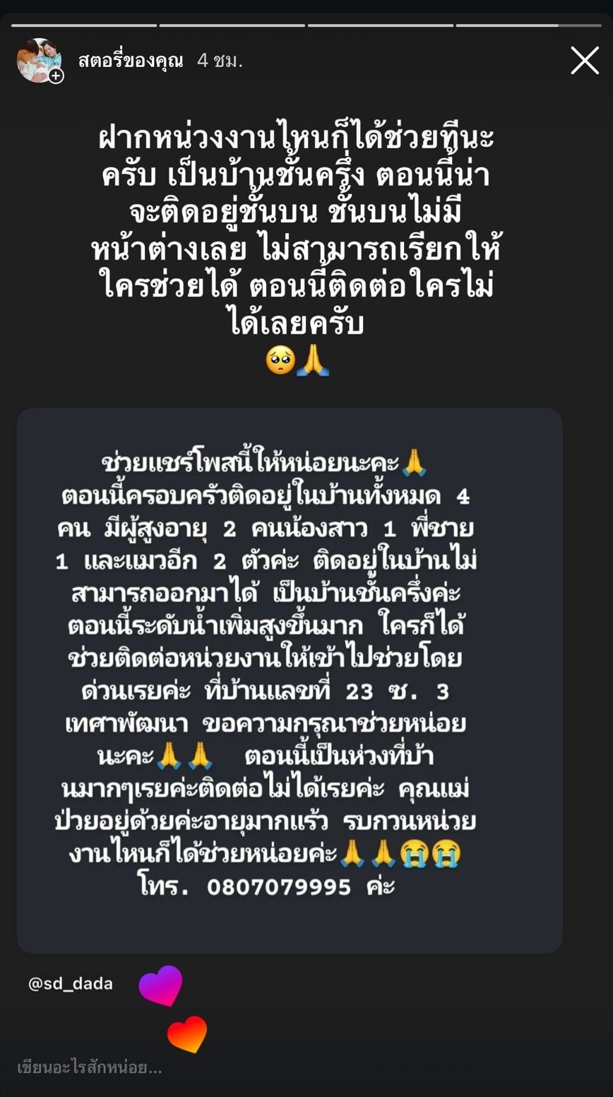 ผู้ประสบภัยไม่สามารถติดต่อใครได้ และกำลังขาดการเชื่อมต่อกับโลกภายนอกอย่างสิ้นเชิง โดยมีเบอร์ติดต่อขอความช่วยเหลือระบุไว้ 080-707-9995